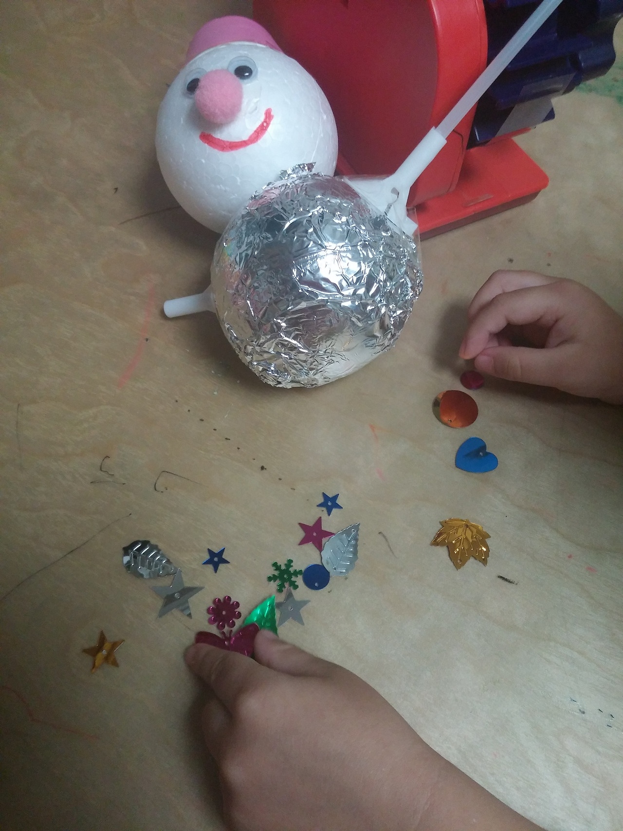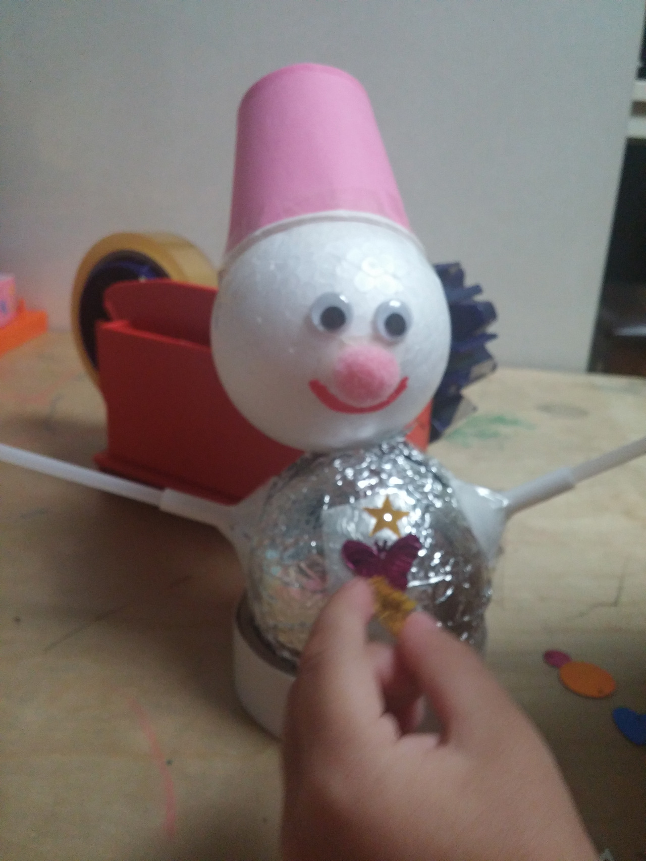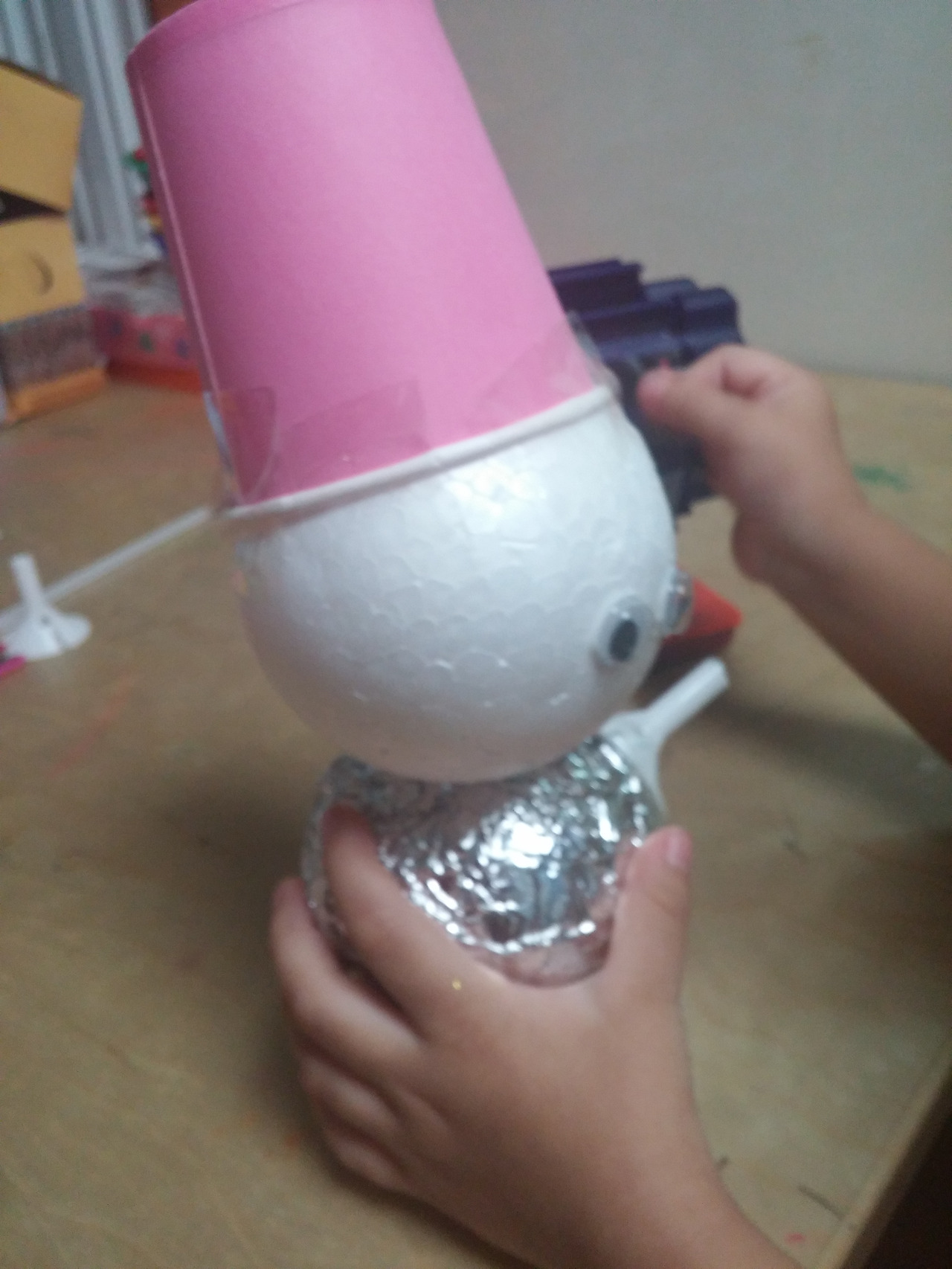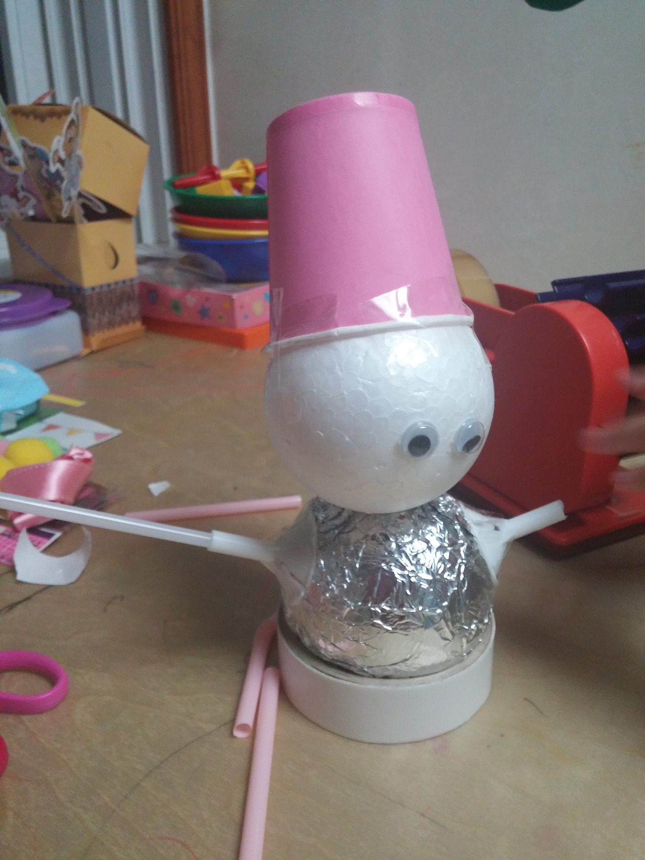 은박호일로 옷을 만들고 풍선 빨대와 깔대기?로 팔도 만들어 주었다