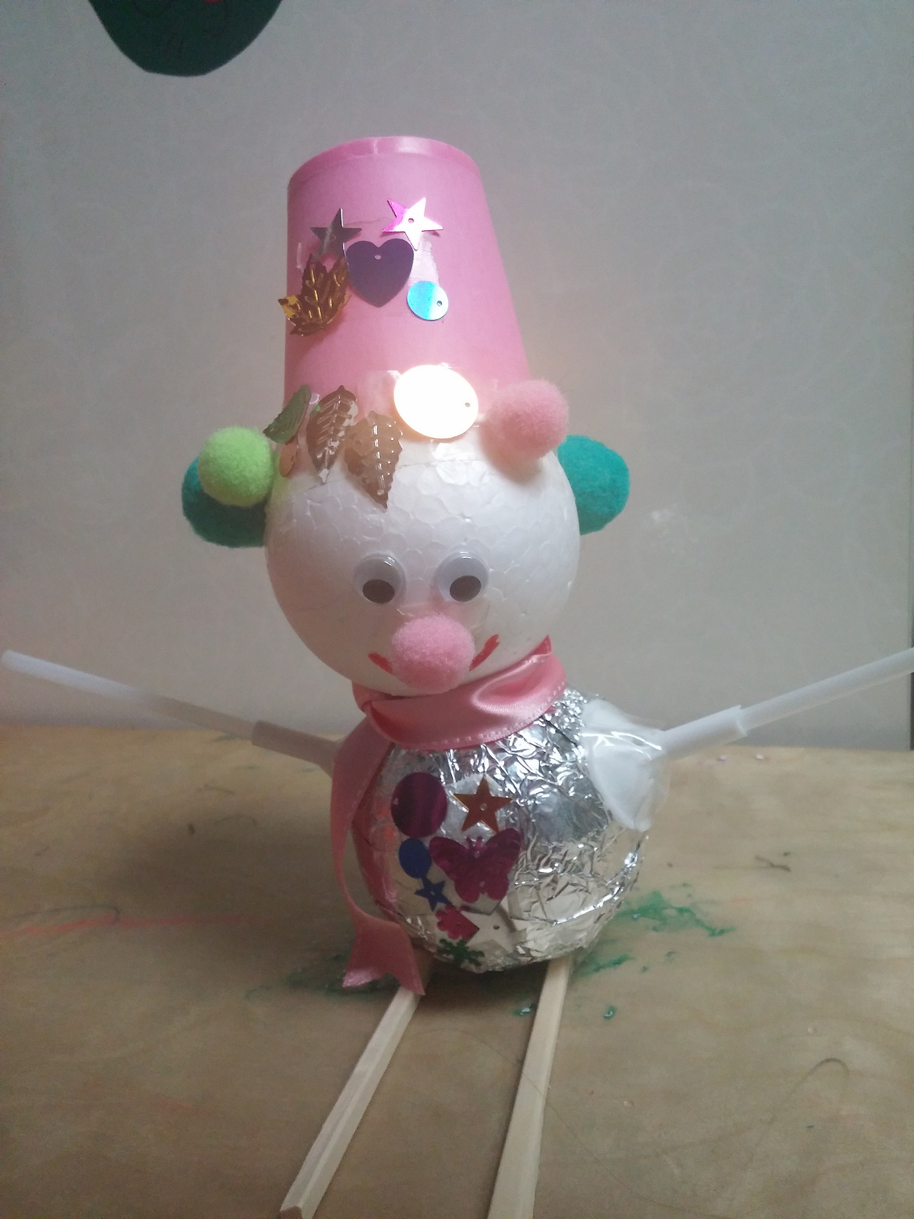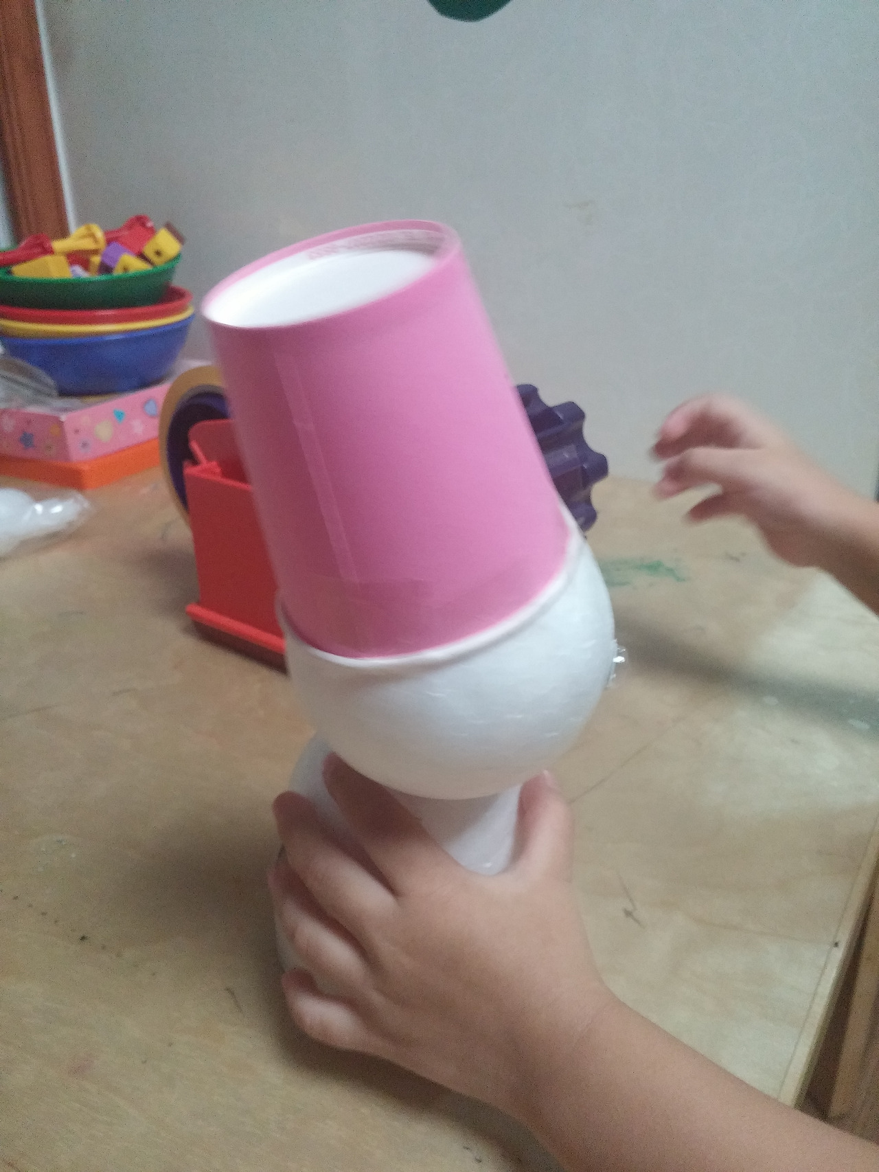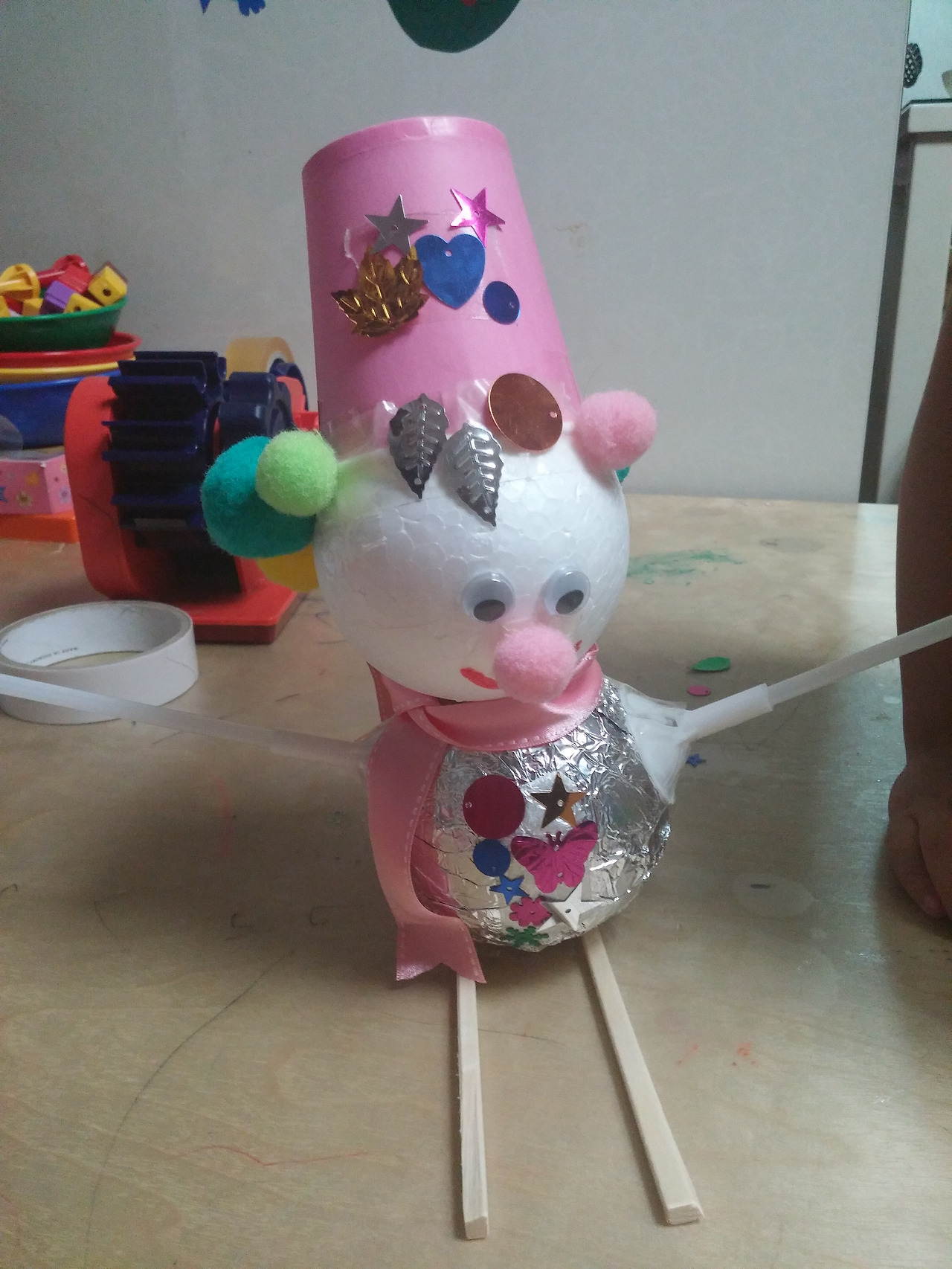 고정한 스트로폼에 눈을 붙이고 딸 아이는 종이컵으로 모자도 만들어 주었다