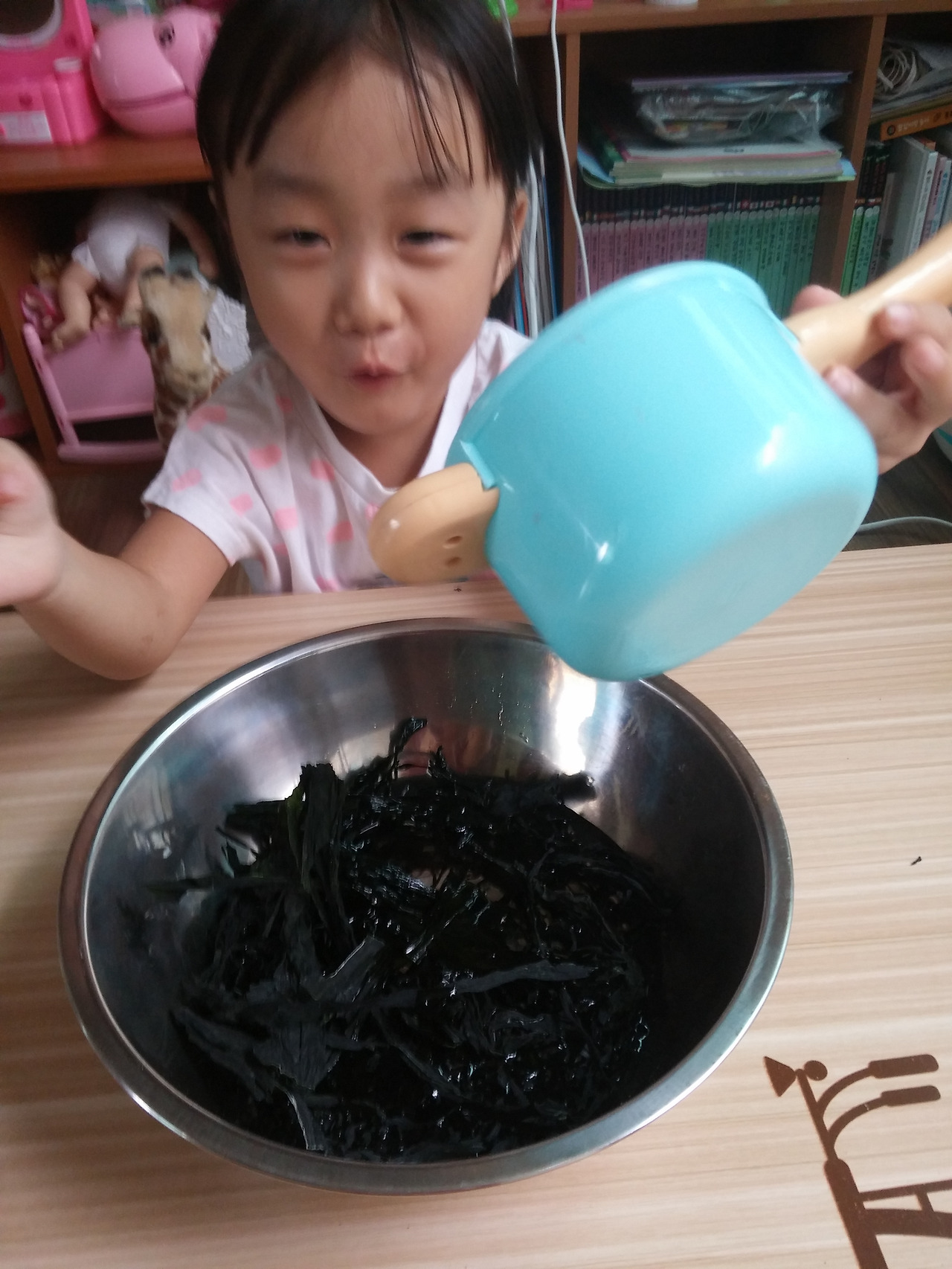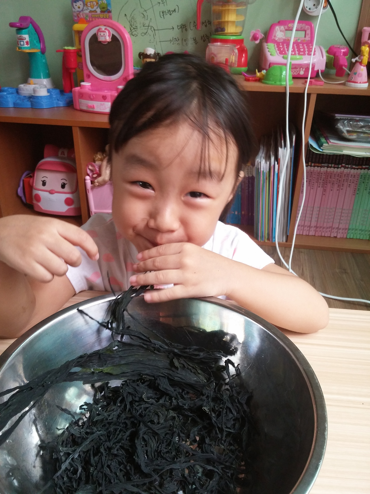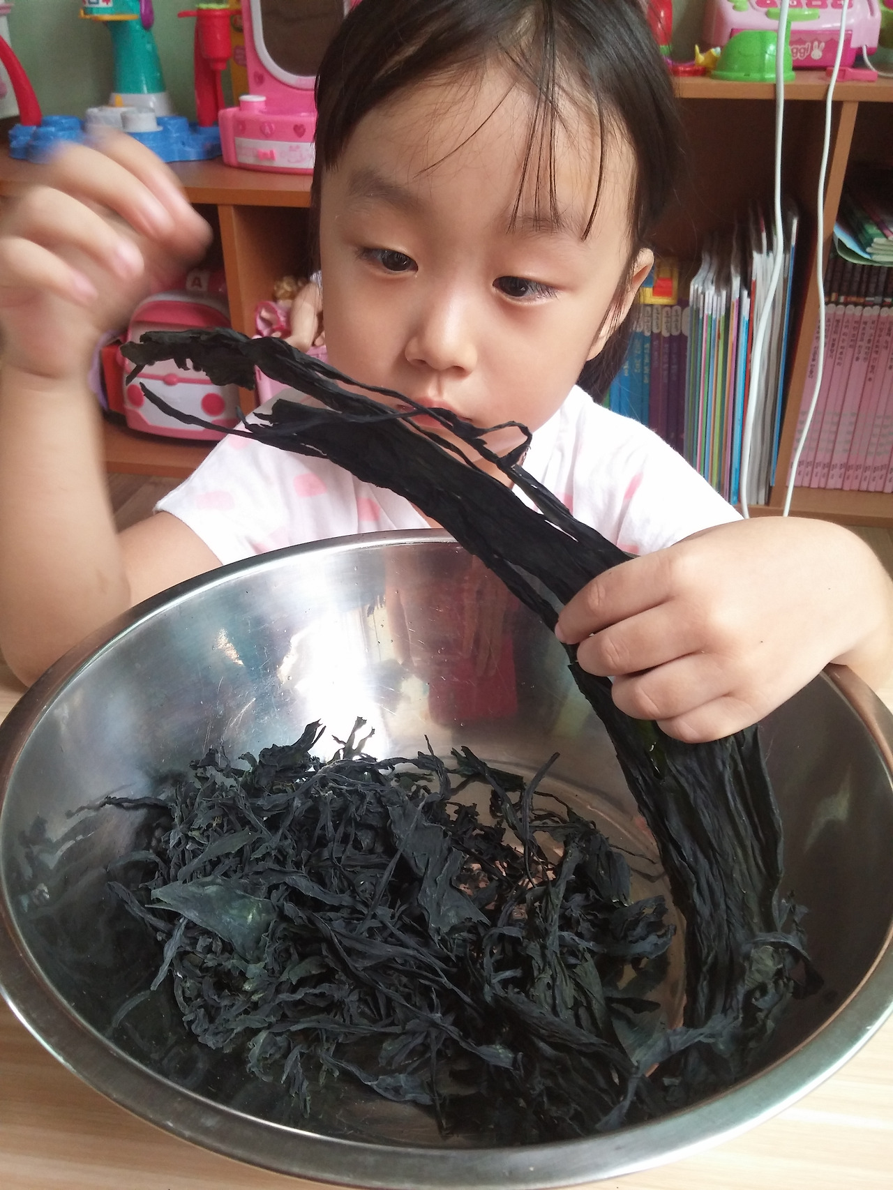 그 덕분에 집엔 미역이 많이 있고 오늘 우린 그 미역으로 미역놀이를 해 보았다