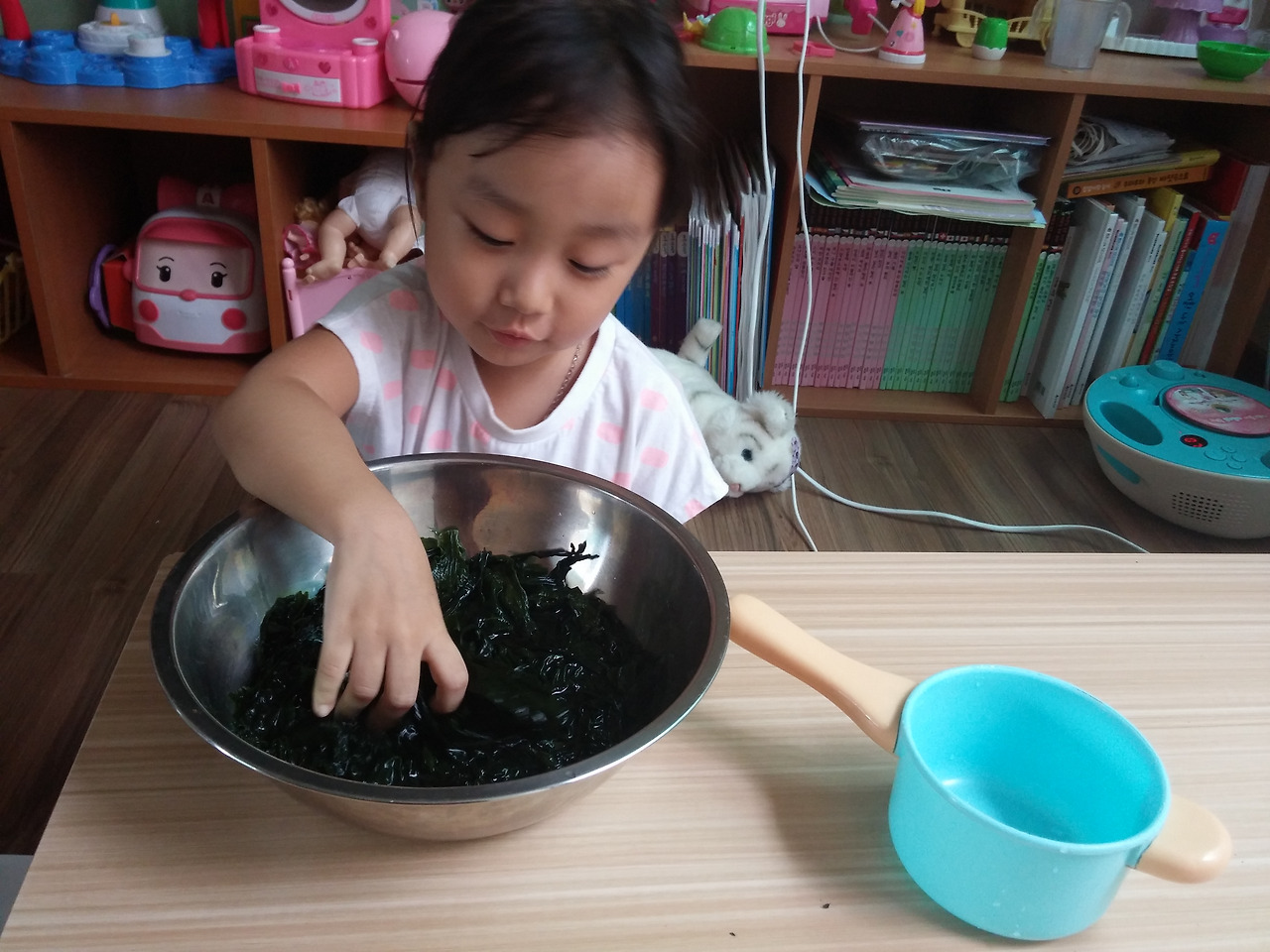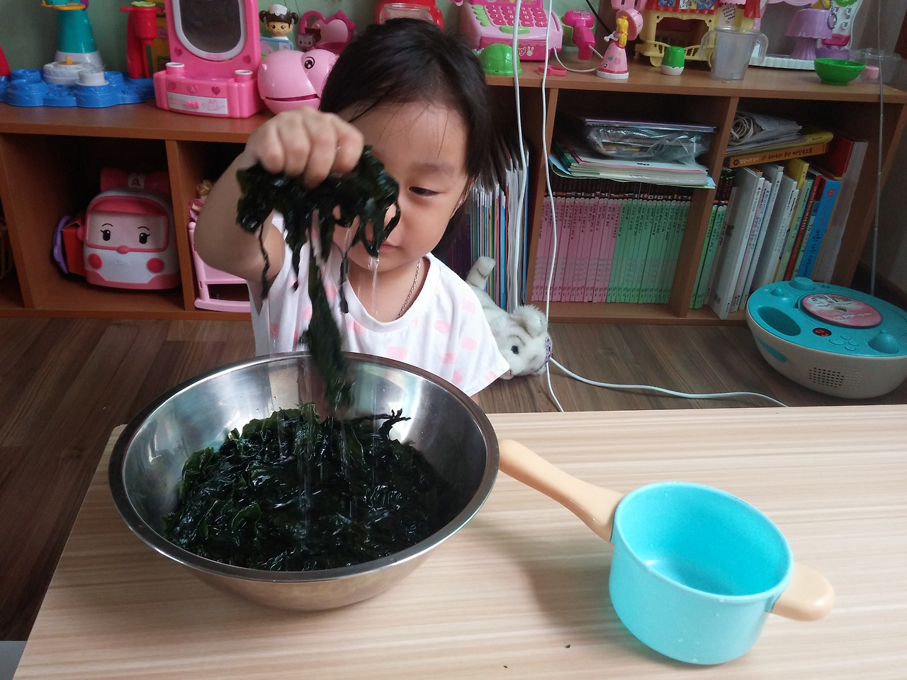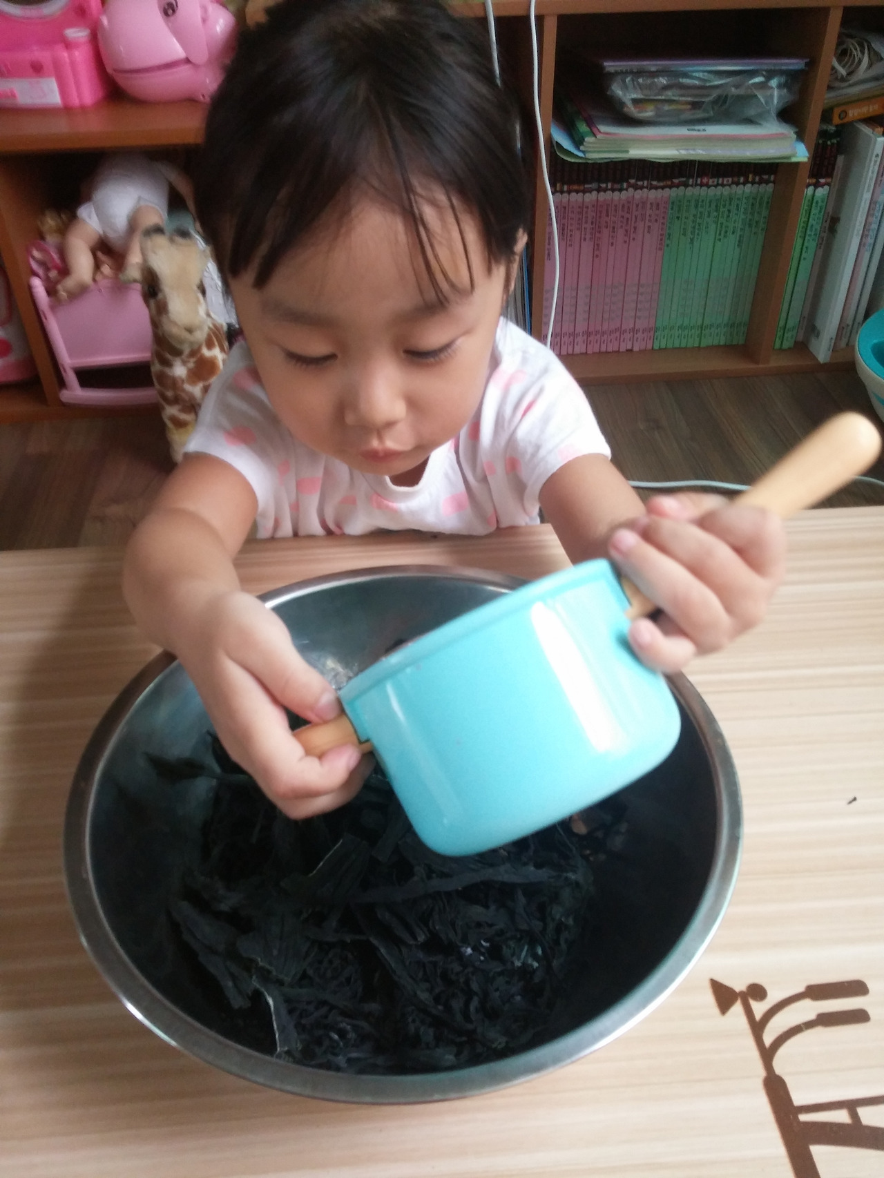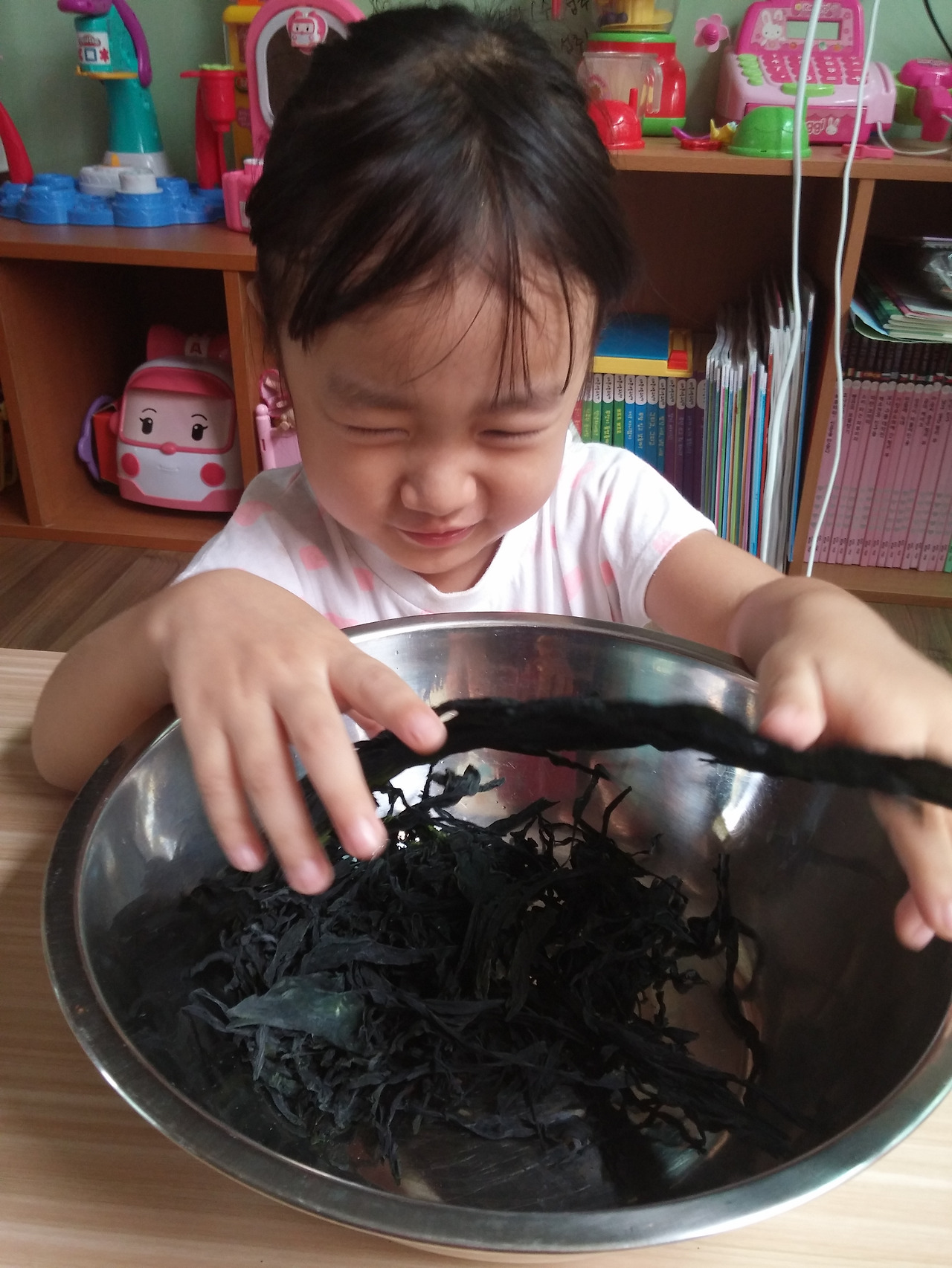 그 덕분에 집엔 미역이 많이 있고 오늘 우린 그 미역으로 미역놀이를 해 보았다