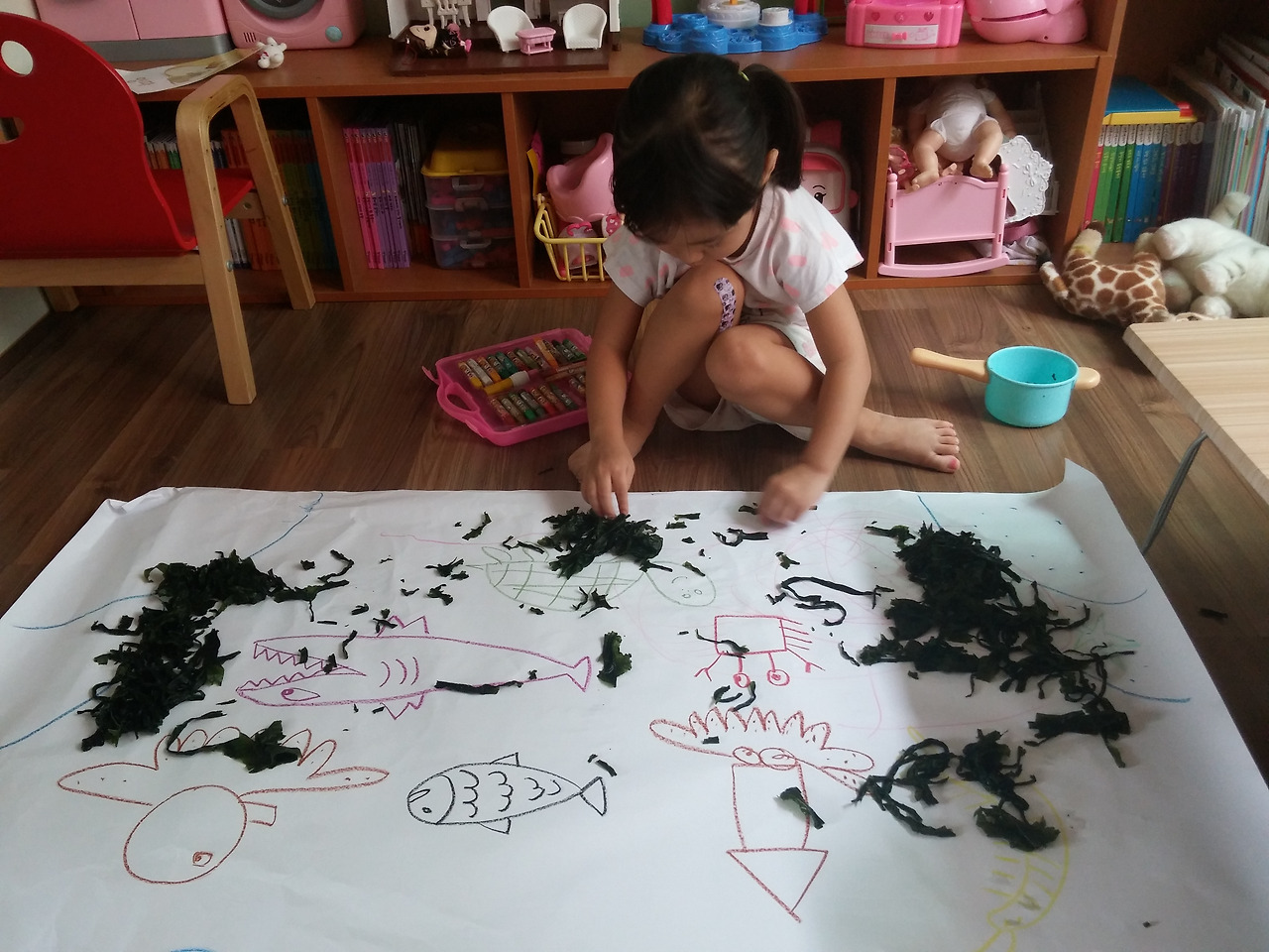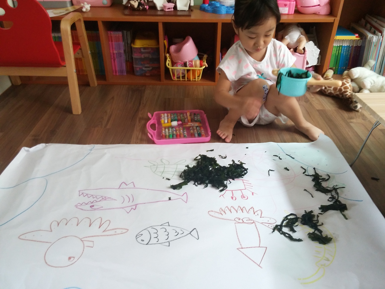 미역에 물기를 짜내고 바닷속 꾸미기