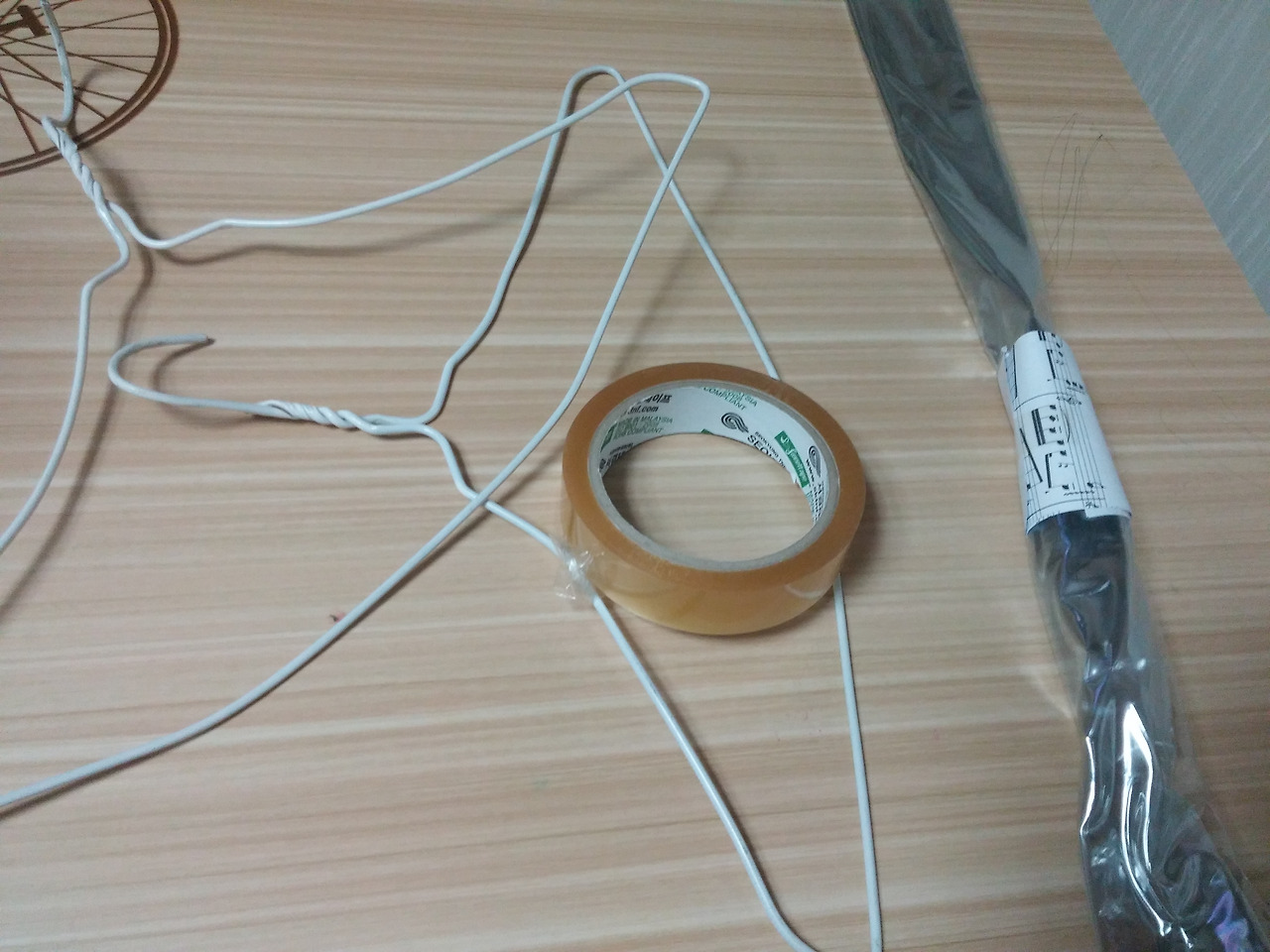 남편은 옷걸이를 쭉하고 늘려 그 안에 날개를 대 놓고 테이프로 붙였다