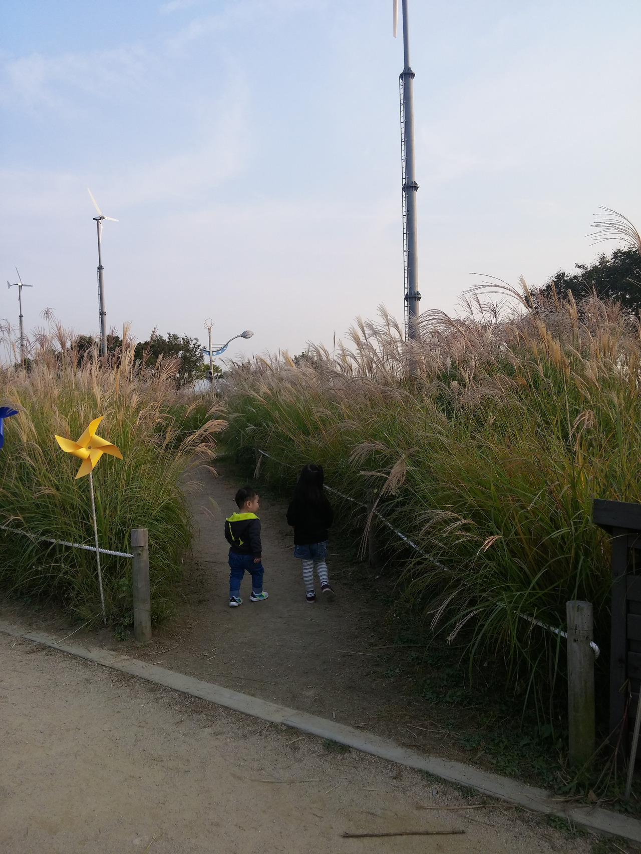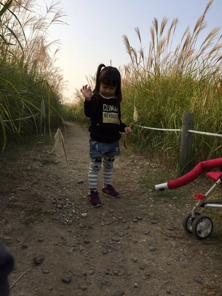 딸 아이가 신이나 억새길 사이를 뛰어다닌다
