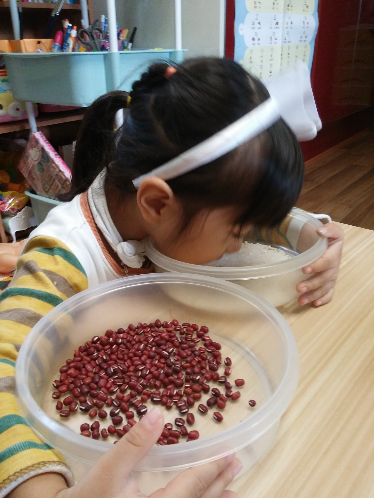 "이건 너무 뾰족하네 조심해요. 자꾸 하얀가루가 묻네 ~팥은 꼭 콩같다" 라며 혼자 종알종알 이야기
