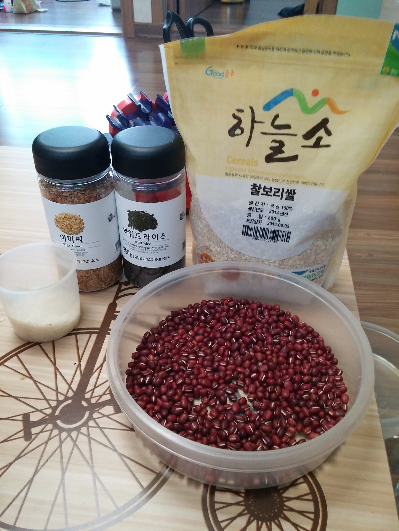 한창 다이어트 한다고 끓여먹다 위경련으로 다시는 쳐다도 안 보고 안 먹는(심지어 좋아하는 붕어 아이스크림도 먹지 않게 해 준) 팥과 선물받은 아마씨.생전 처음 본 와일드라이스 그리고 냉장고 한켠 있는지도 몰랐던 보리를 준비했다