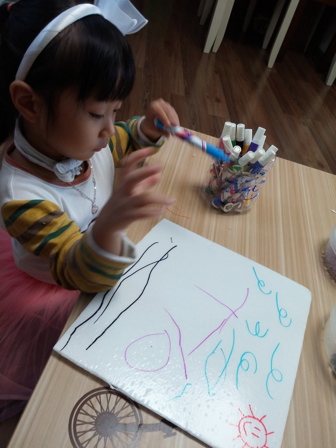 스티커도 붙이고 싶다는 딸 아이가 미술도구 함에서 스티커를 꺼내 와 여기저기 불이며 이야기를 꾸민다