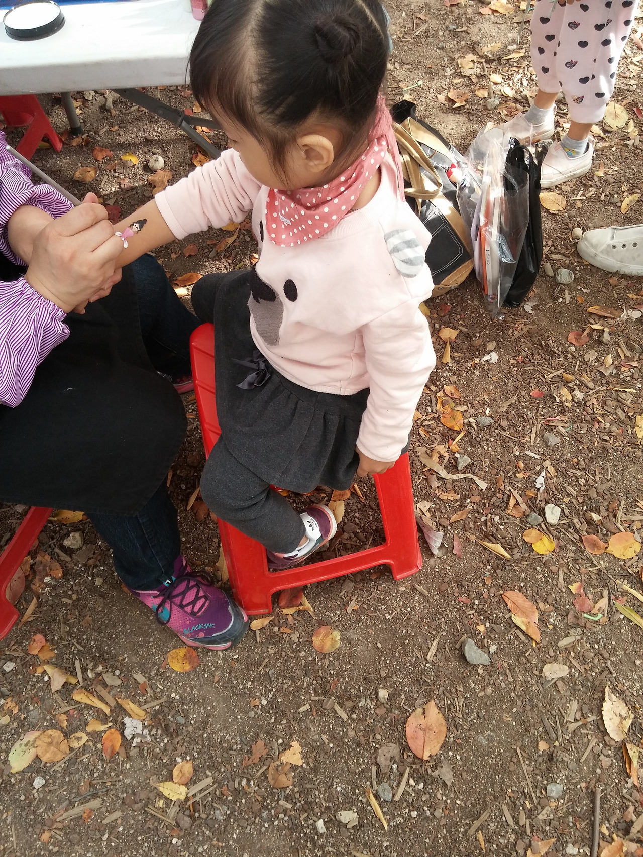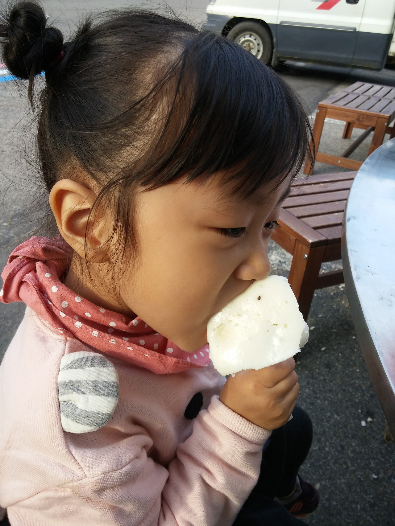 밖으로 나와 자리잡고는 본인이 만든 떡 하나를 다 먹고는 주변에서 놀고있는 아이들틈에 자연스럽게 다가가 논다