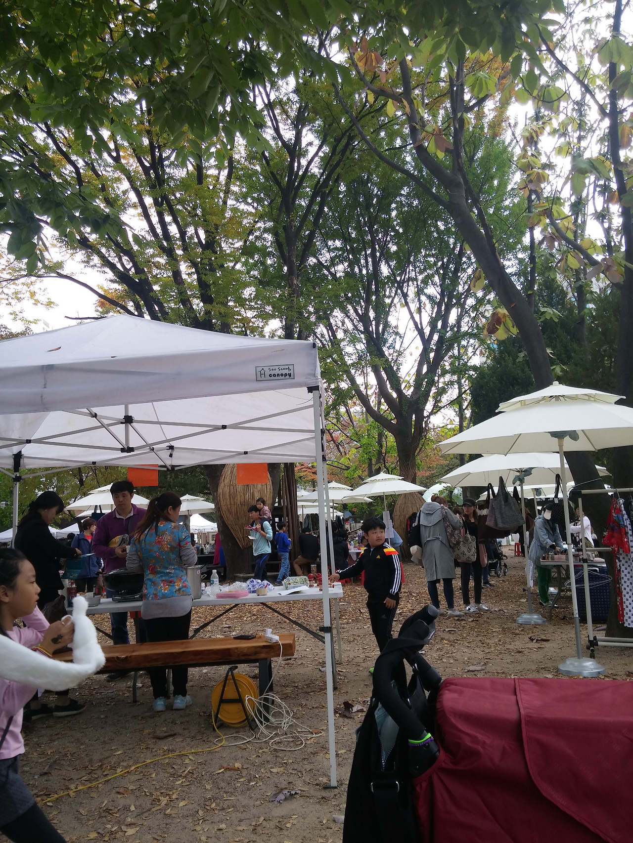 30분쯤 자고 일어난 아이가 주변을 둘러보더니 함박웃음을 띠며 유모차에서 내린다
