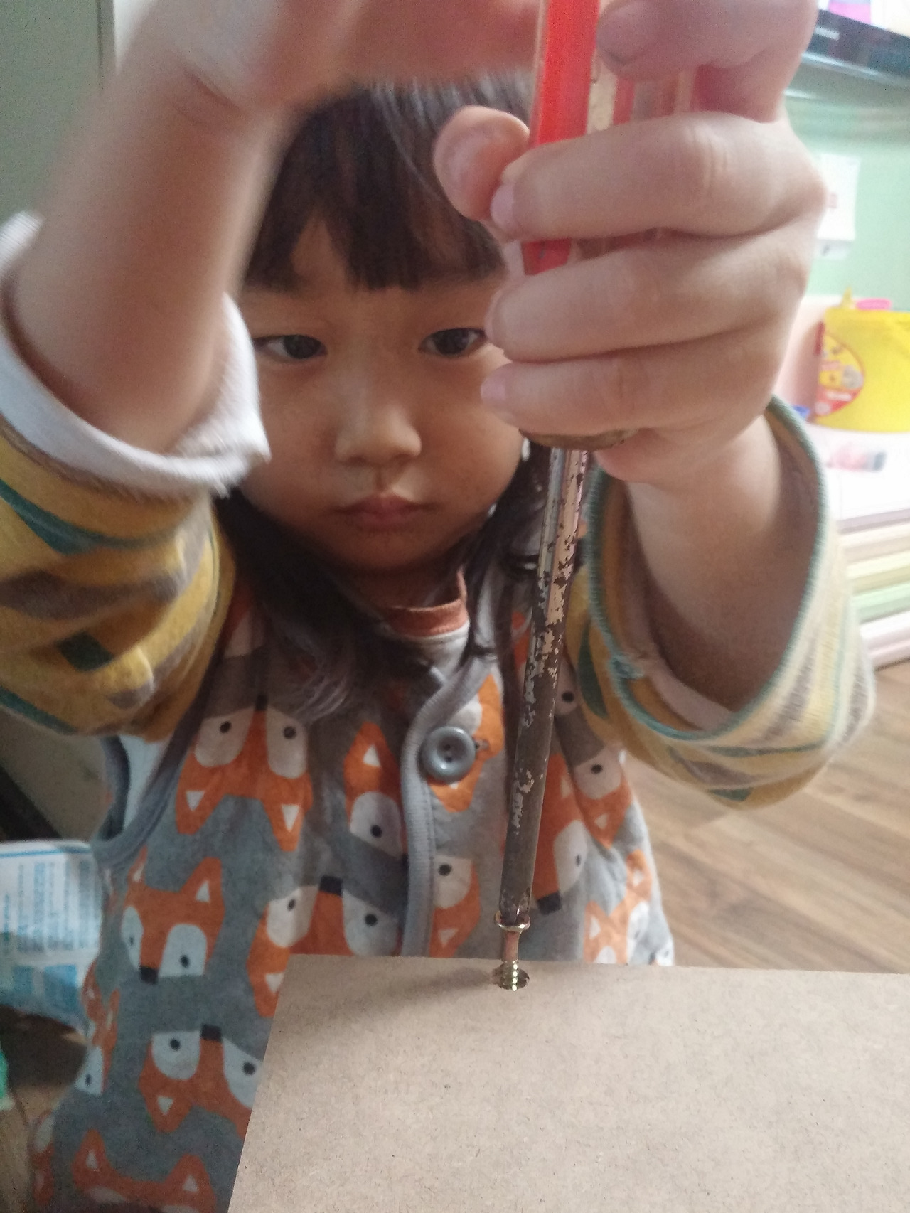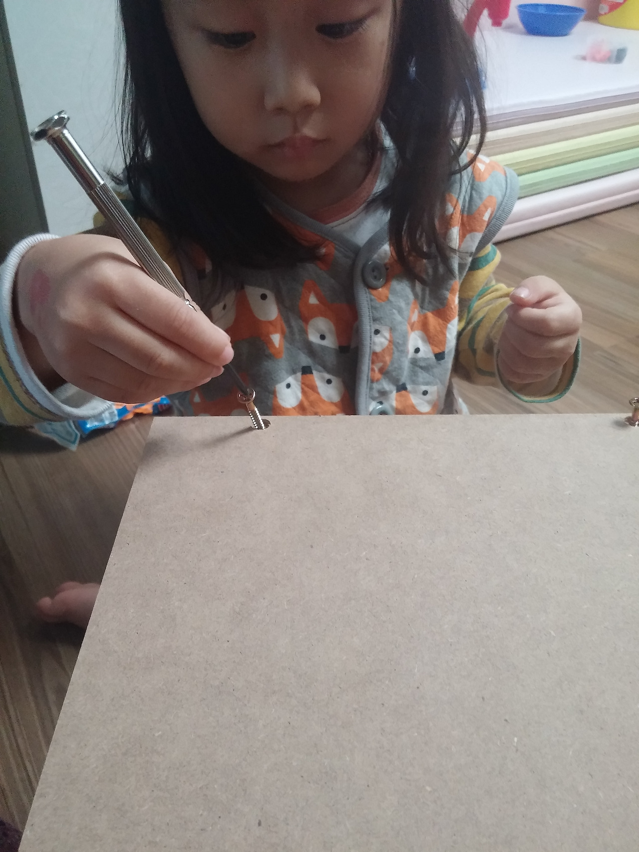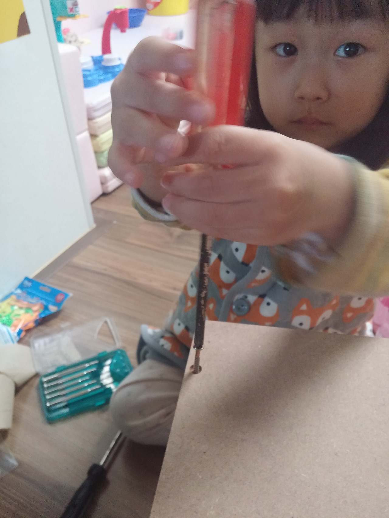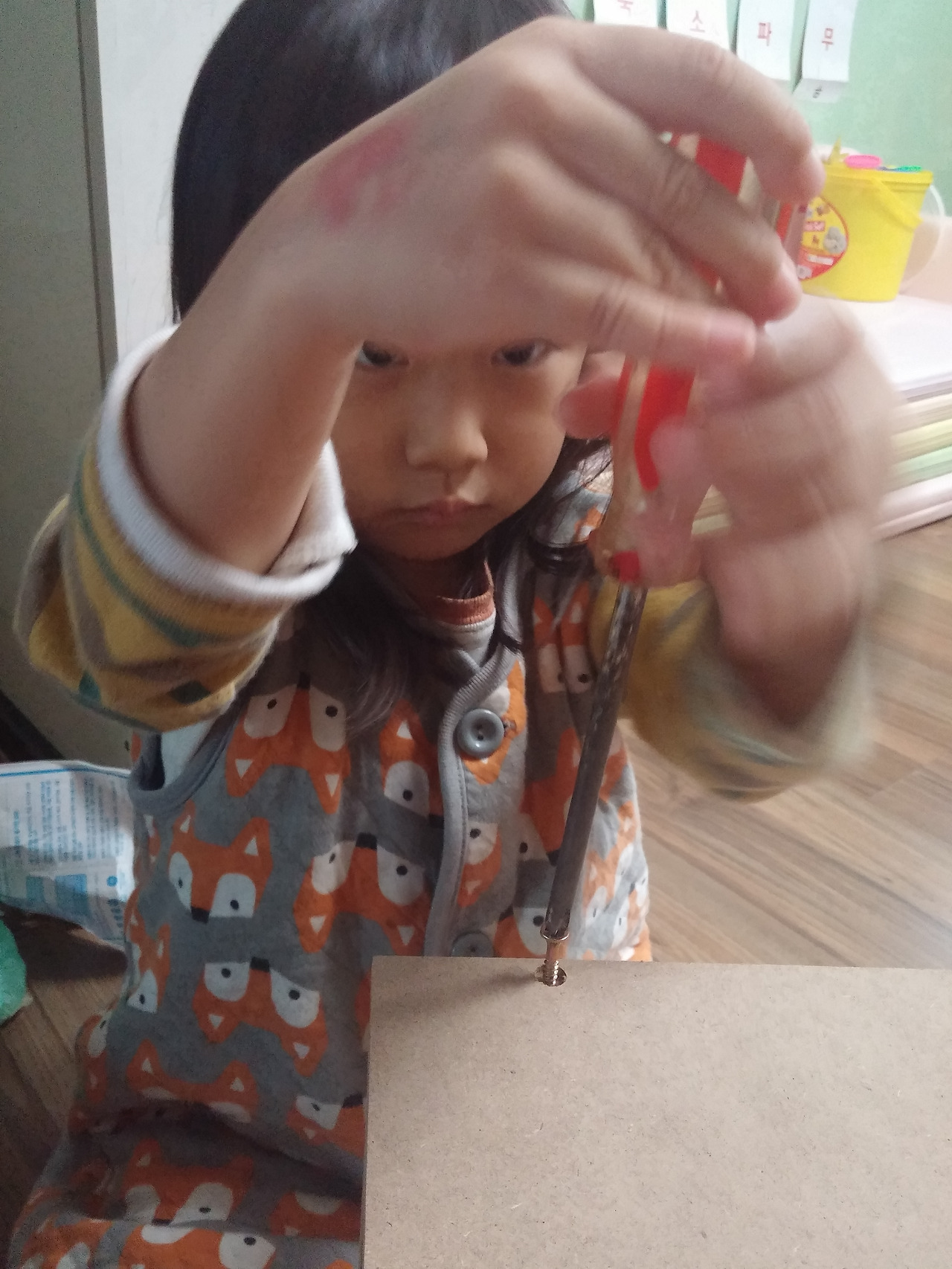 시계방향으로 돌리면 나사못이 들어가고 반대로 돌리면 나오는 걸 보면서 아이 혼자 어떤 방향으로 나사못을 돌리며 박아야 하는지 생각해보라고 했다