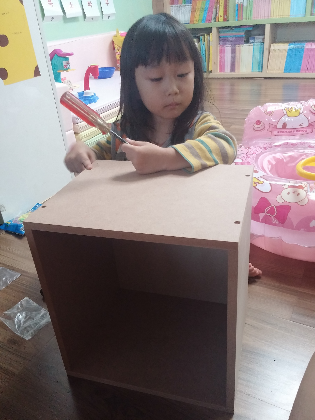 나사못에 드라이버를 맞추며 눈과 손의 협응력을 길러주고 드라이버를 사용하면서 팔과 손의 대.소근육을 길러주는 참으로 재미있는 놀이라고 생각하고는 DIY로 조립하는 공간 박스를 구입했다
