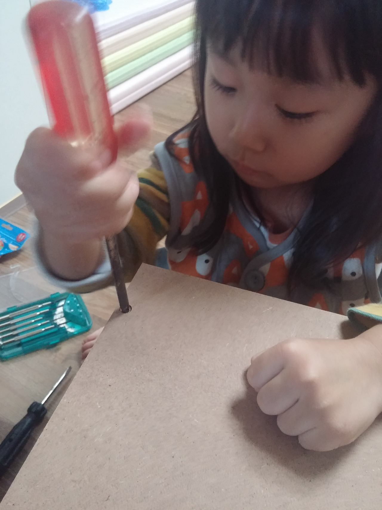 구멍에 나사 못을 낳고 드라이버를 맞추어 끼우는 딸(사진엔 없지만 나사못 위와 같은 십자모양 드라이버를 찾는 활동을 통해 일자와 십자 드라이버를 구별해 보았다)