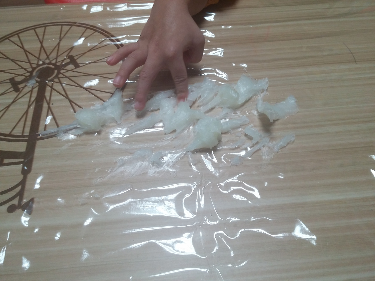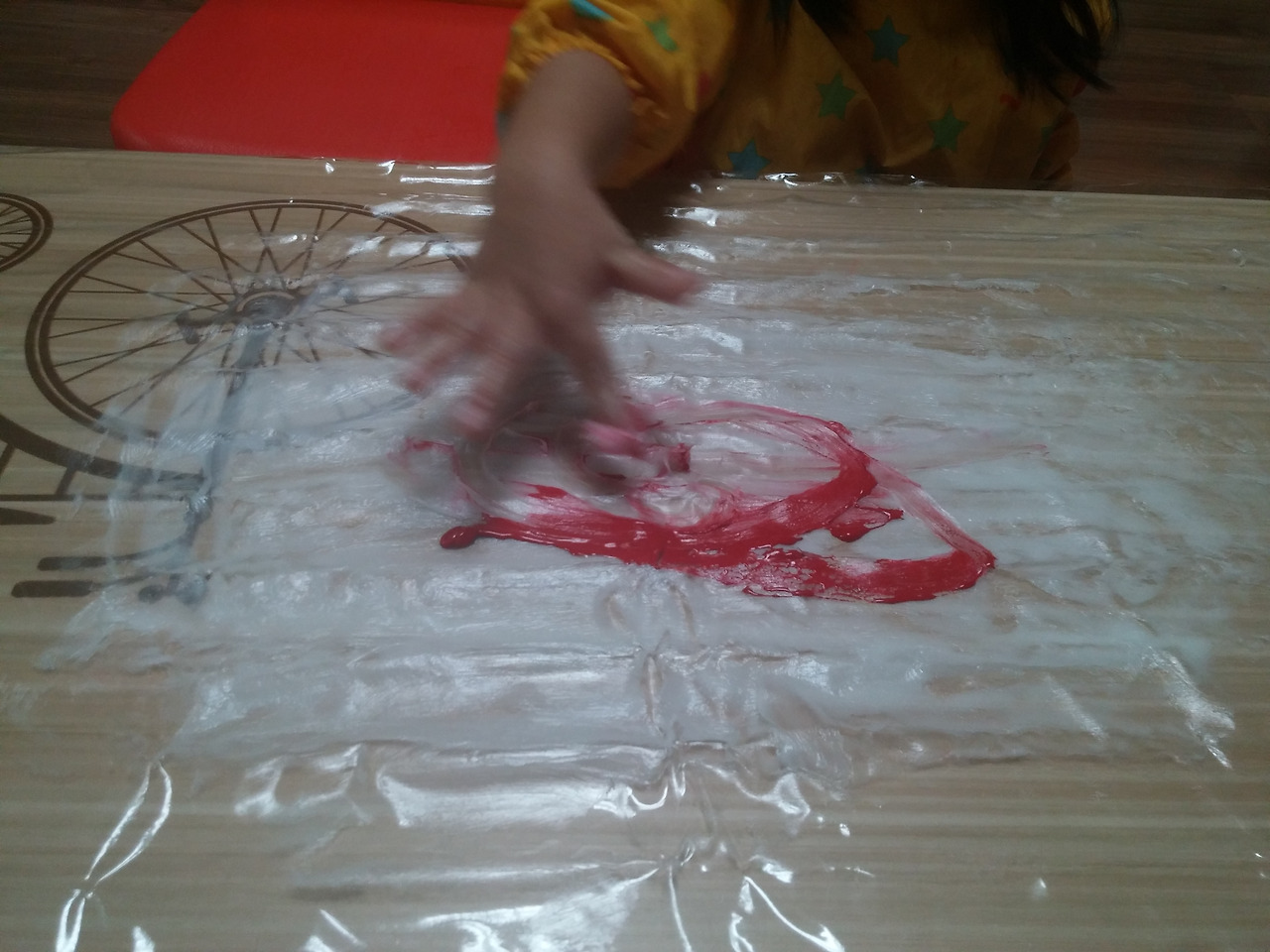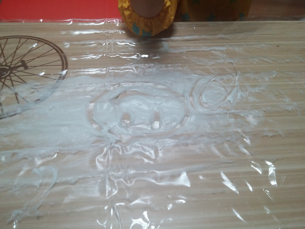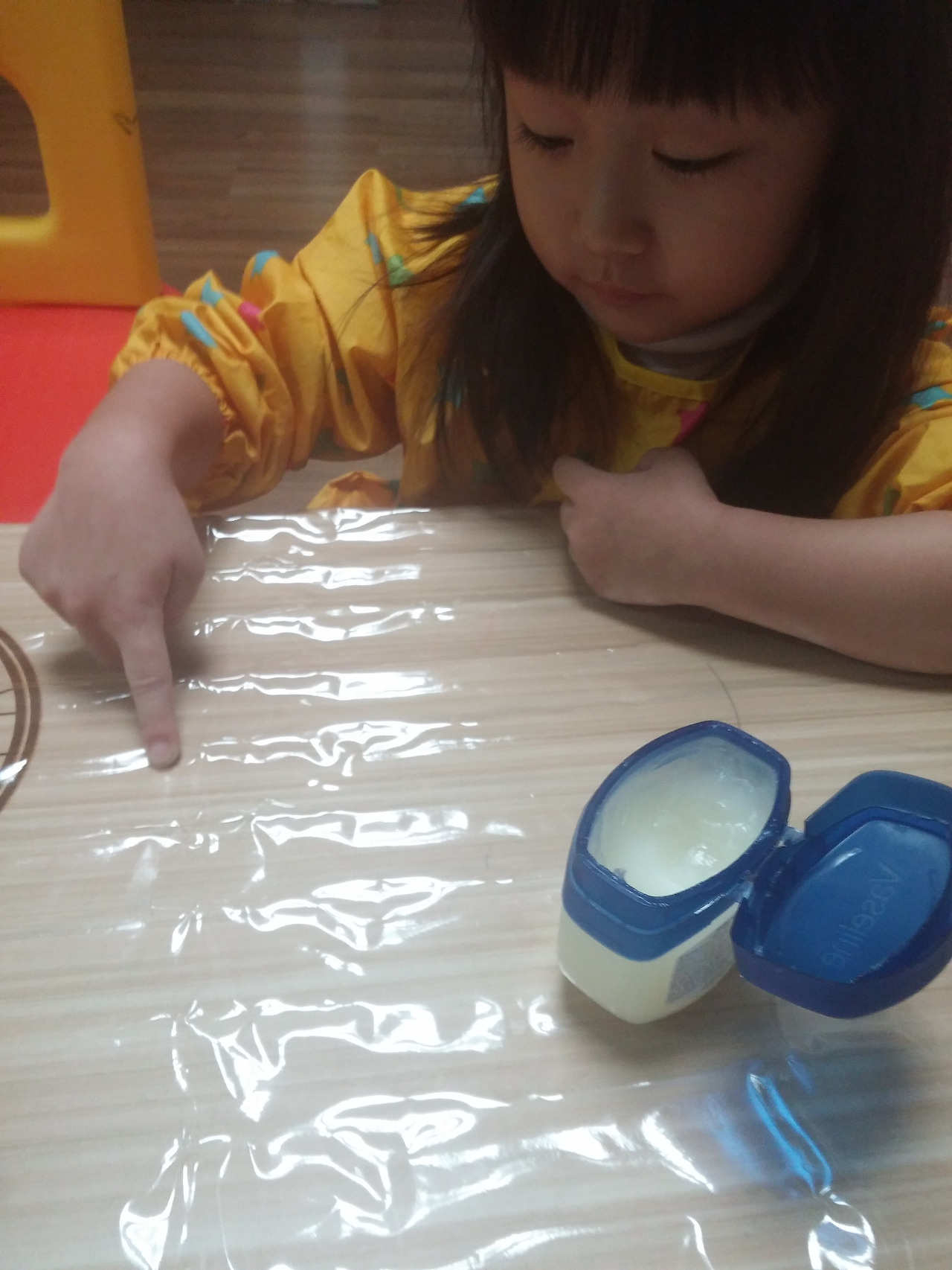 비닐위에 바세린을 덜어 만져보며 탐색한다.