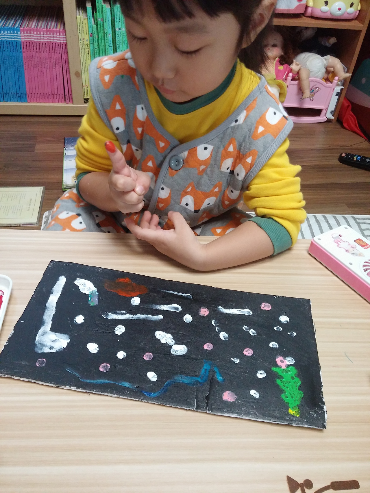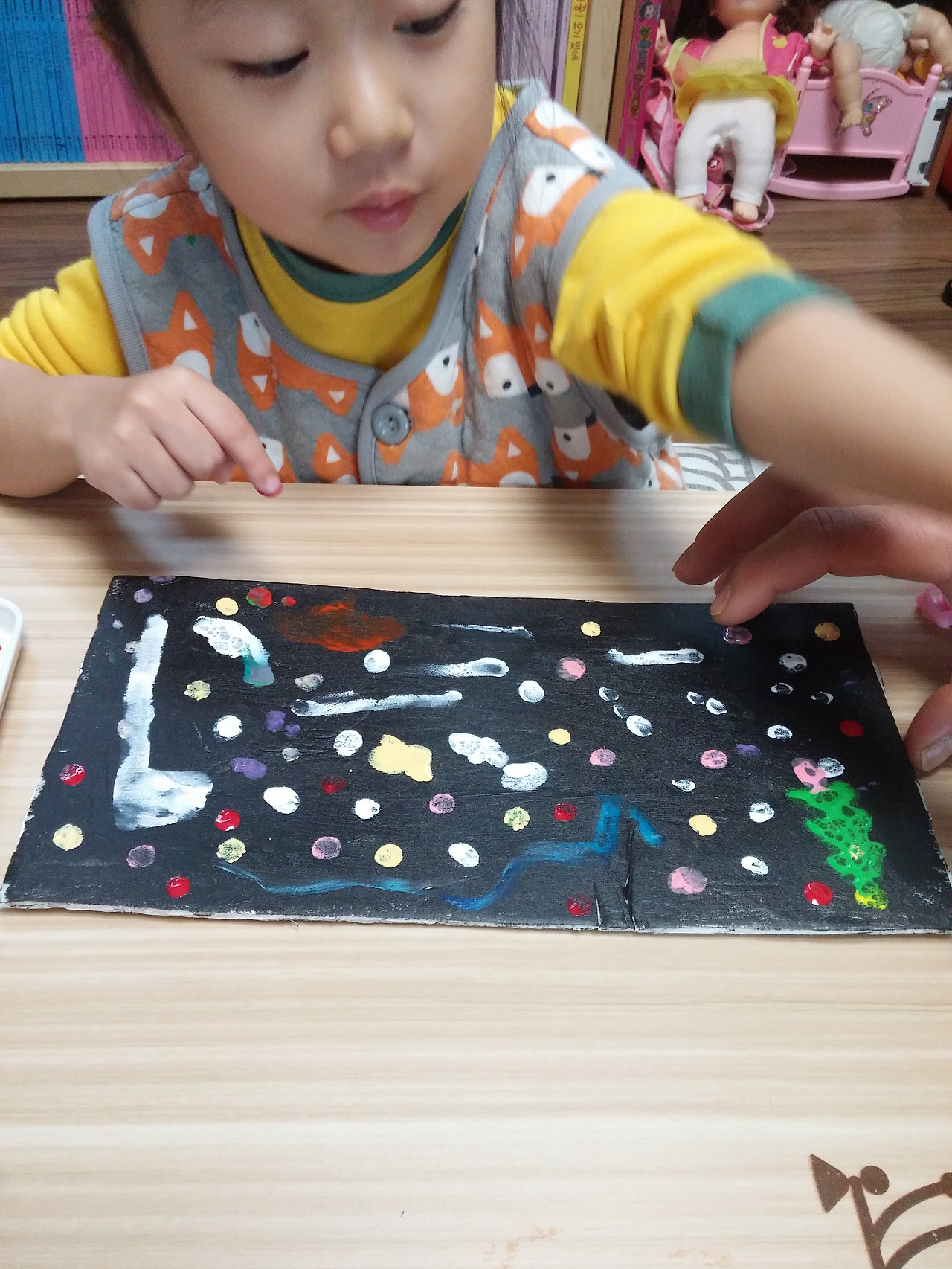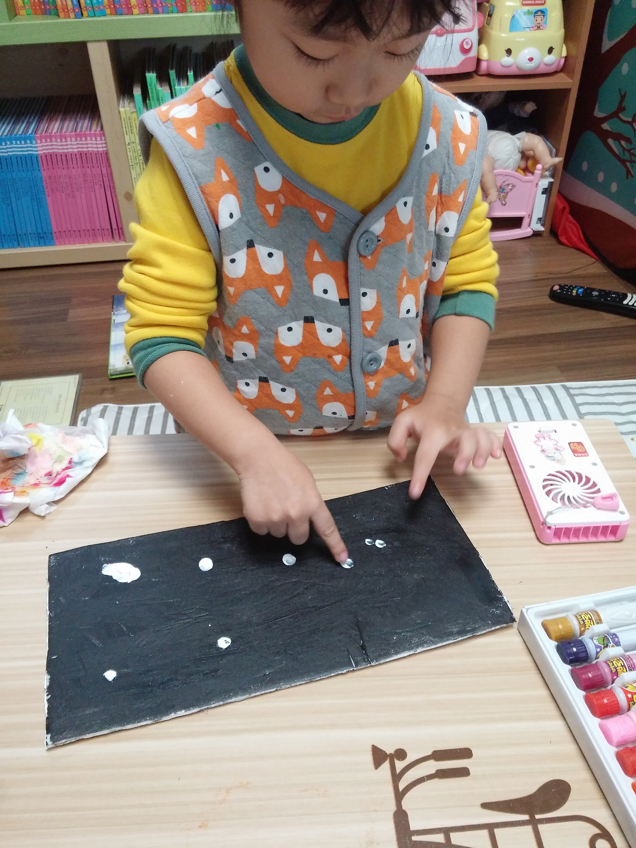 10분 정도 후 거의 다 마른 검정판에 손가락으로 눈 표현하기 물감을 손가락에 묻혀 콕콕콕