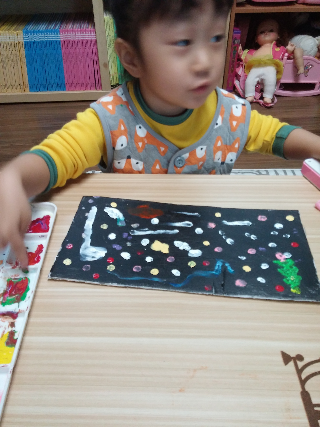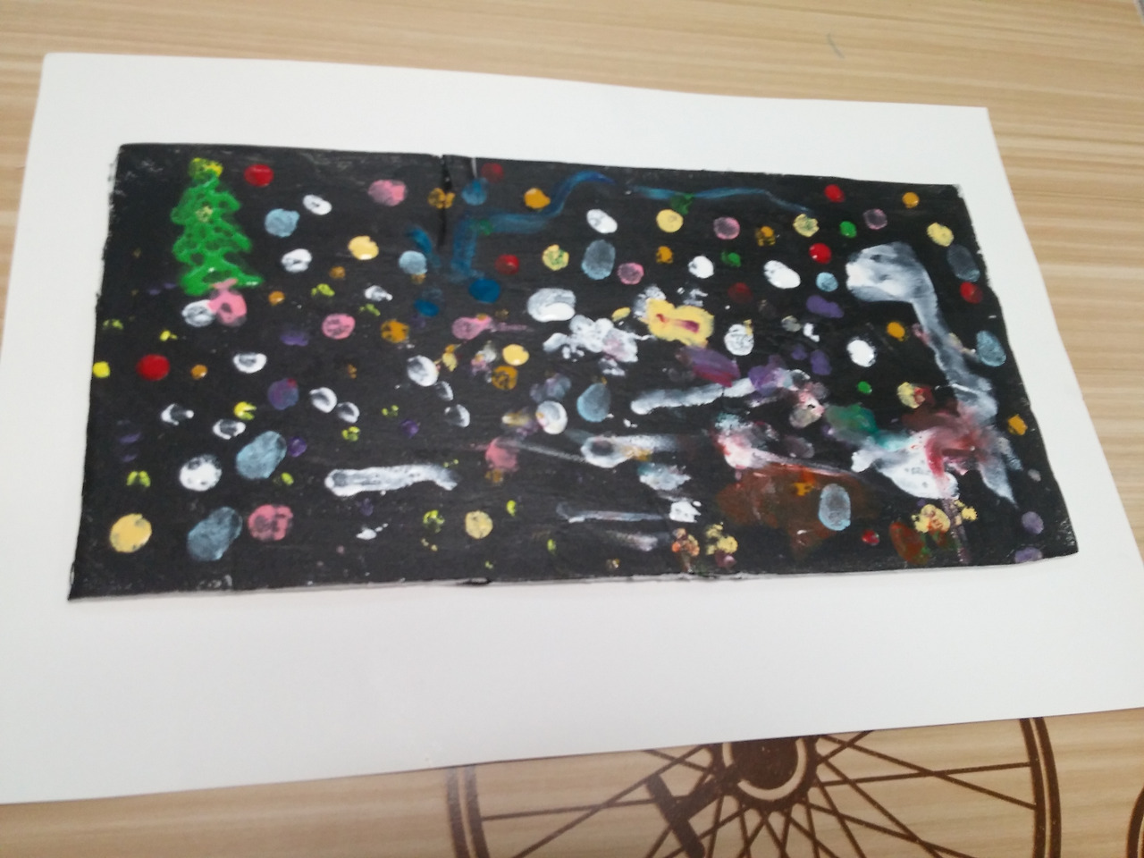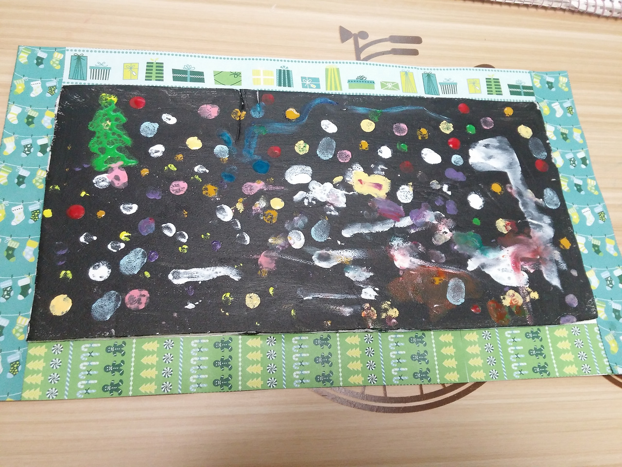 10분 정도 후 거의 다 마른 검정판에 손가락으로 눈 표현하기 물감을 손가락에 묻혀 콕콕콕