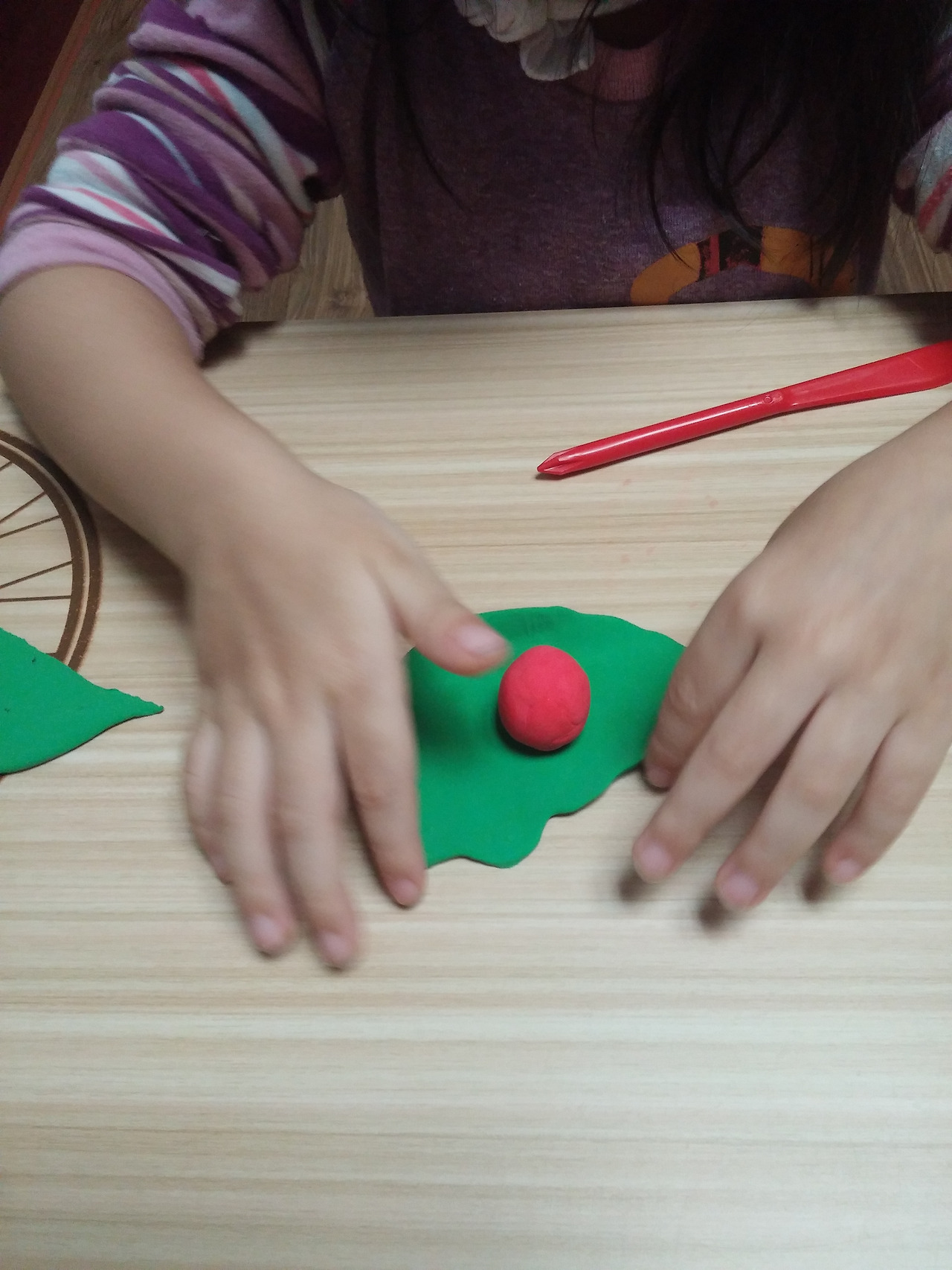 우선 초록 클레이를 밀대로 밀고 빨강색 클레이를 동그랗게 만든 후