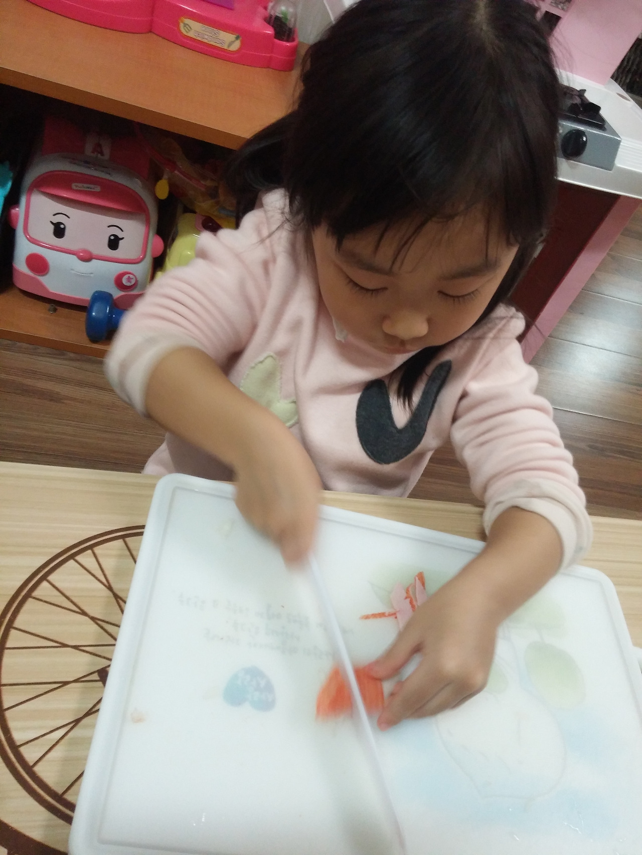 그렇게 자른 재료들을 이쁘게 접시에 담아주라고 하니 제일 사랑하는 엘사 접시에 담겠다는 아이