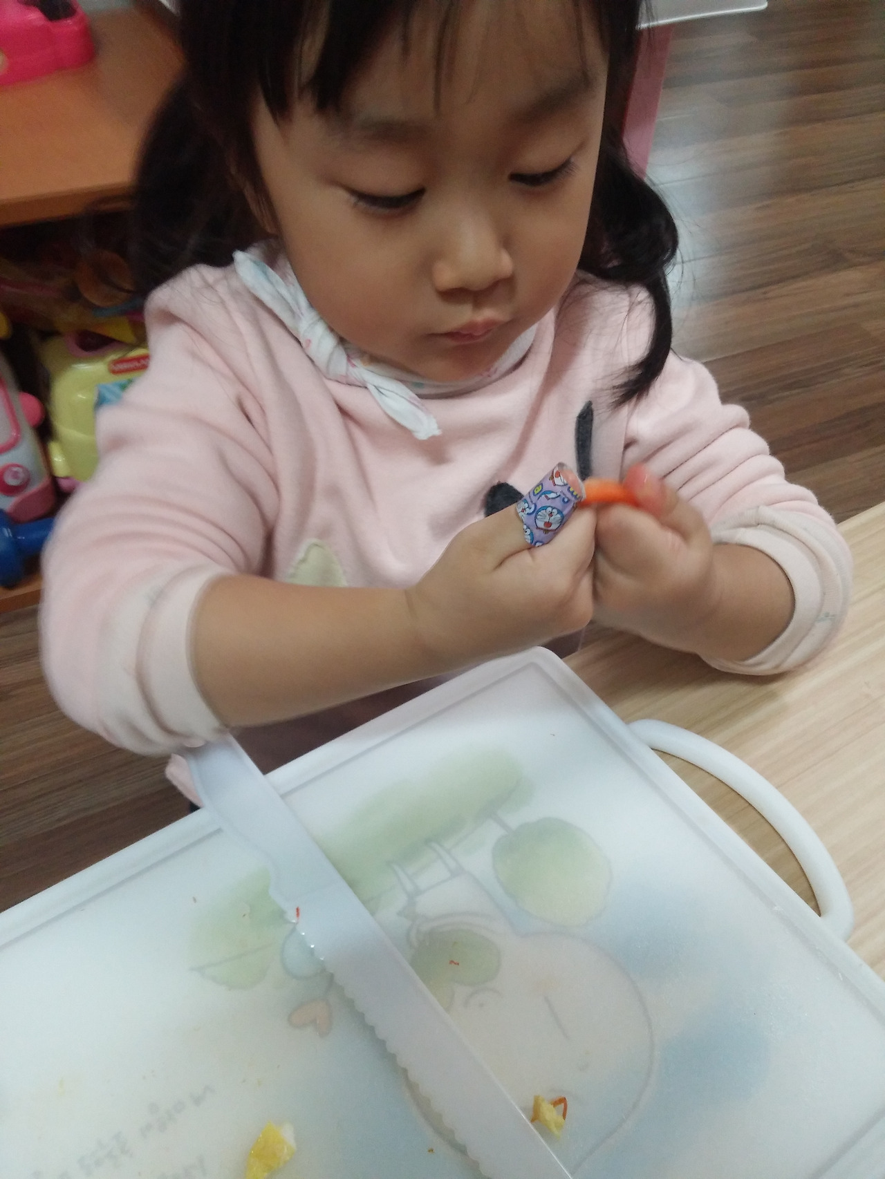 계란도 자르고 당근은 딱딱하다며 뚝뚝 손으로 자른다