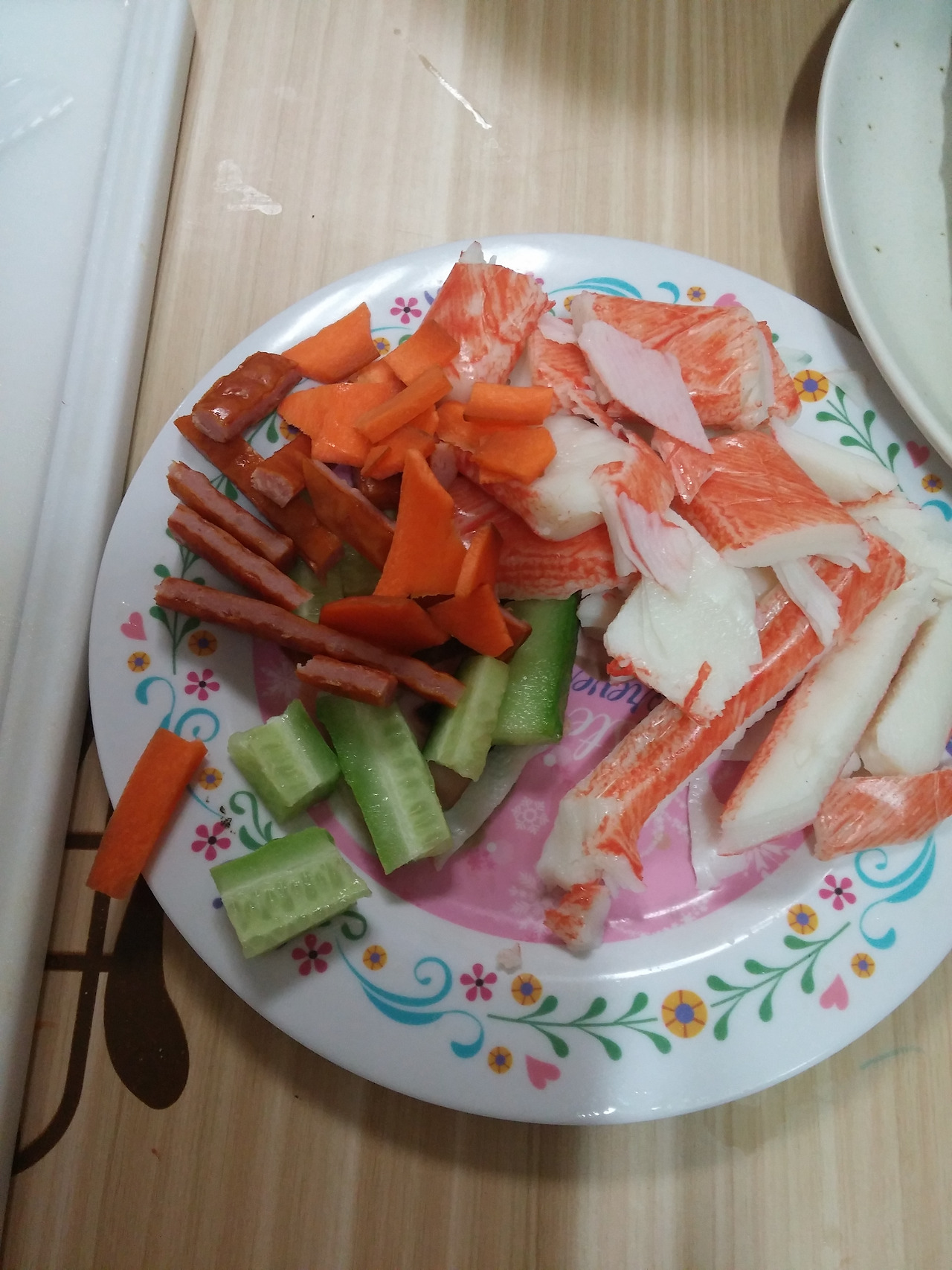 먼저 김밥 속 재료는 햄.크래미.당근.오이.계란.우엉.단무지를 준비했다