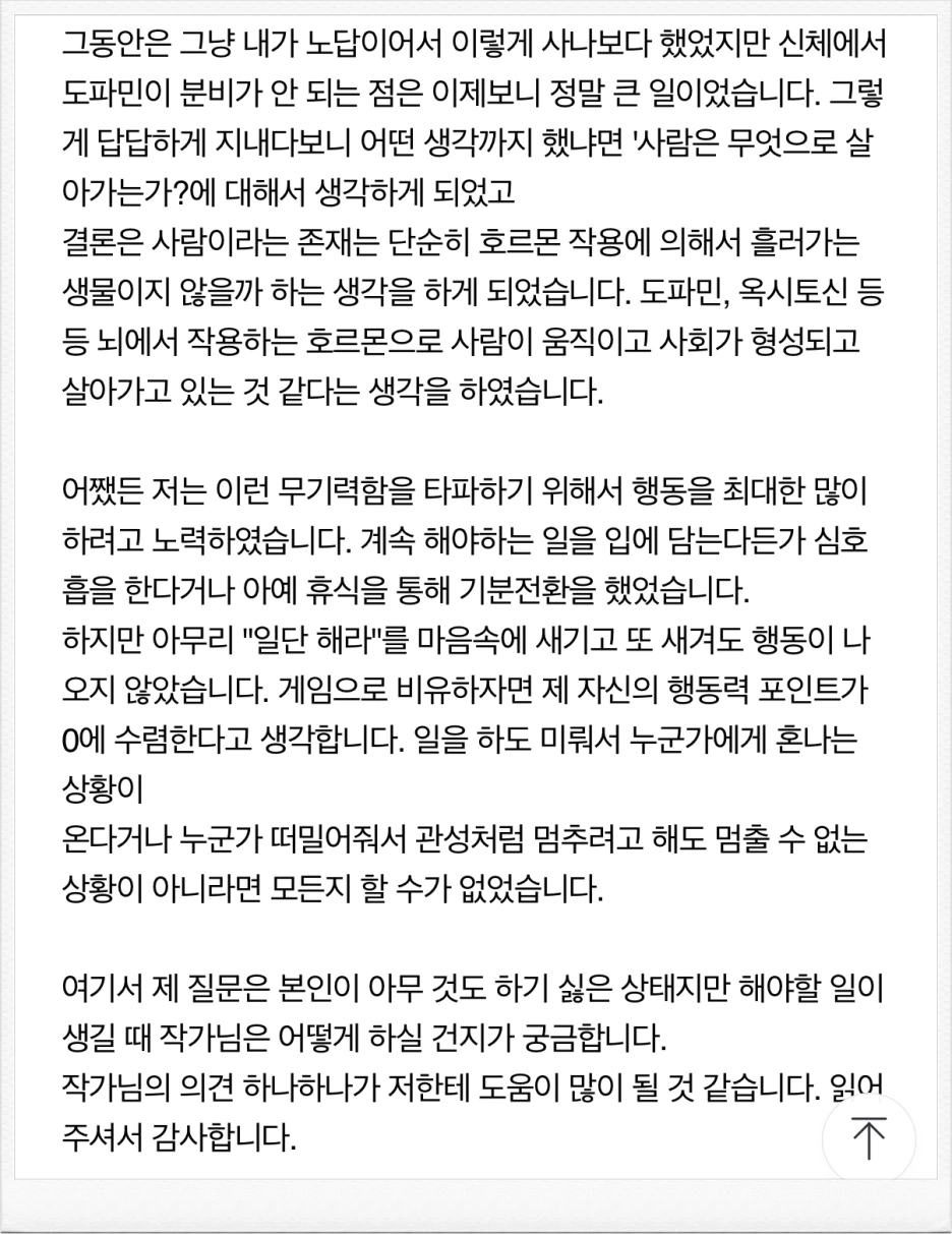 제가 받은 이번에 받은 고민은 '해야 할 일은 있는데, 하고싶지 않다.'입니다.