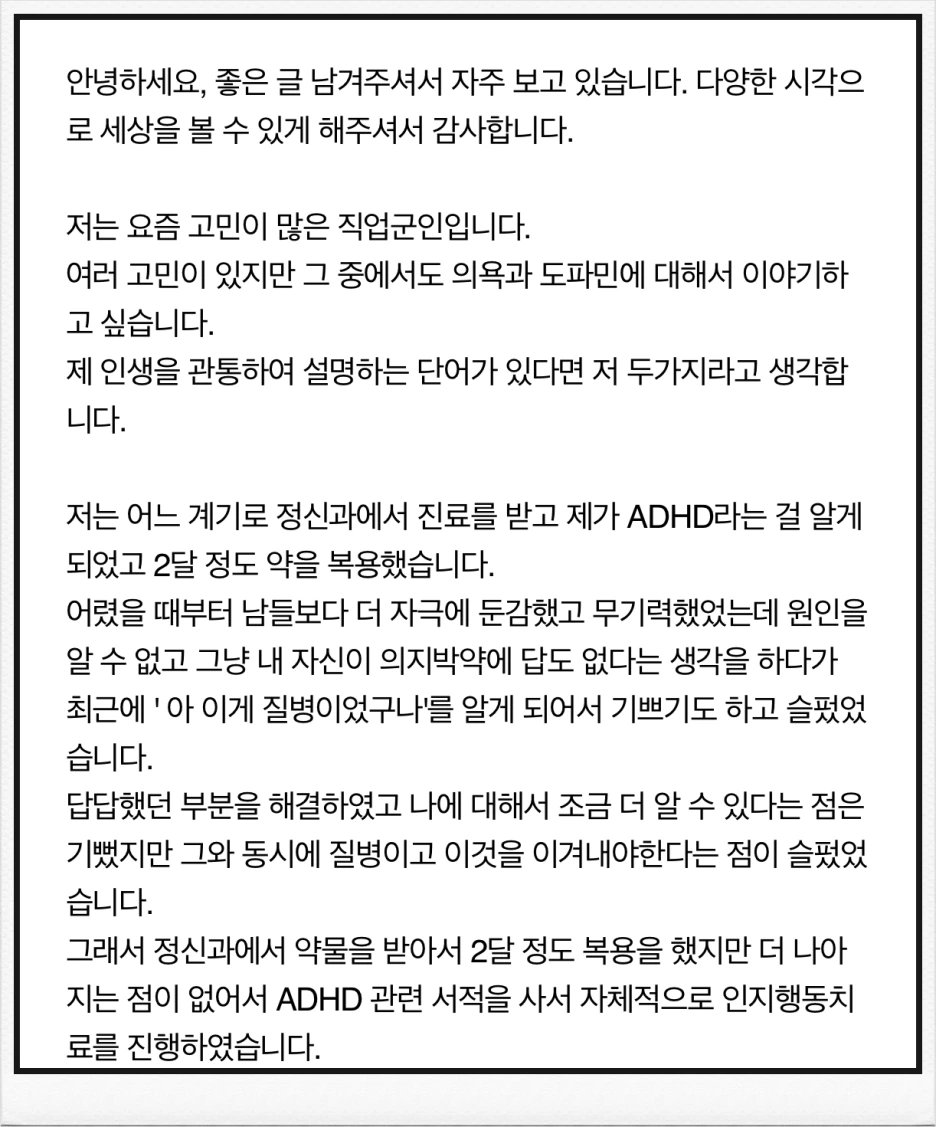 * 제 고민 상담의 답변이 ADHD 환자들에게 다소 맞지 않은 답변일 수 있습니다.