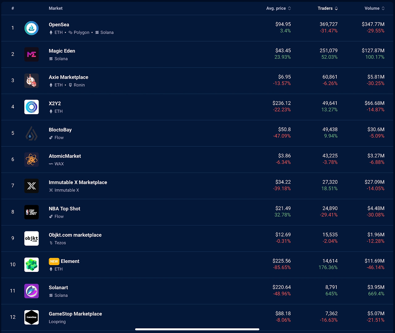 거래량이 줄면 NFT 거래 플랫폼도 어렵다. 개인 간(P2P) 거래 금액에서 수수료를 수취하는 사업구조이기 때문이다. 게임스탑(GameStop)은 기존 사업의 어려움을 타개하고자 7월에 NFT 마켓플레이스를 오픈했지만, 8월 말 기준 하루 거래량이 2억이 조금 넘었고, 먹은 수수료(2.5%)는 5백만 원 수준이었다. 7월 베타 오픈 첫날에만 약 26억 원 수준의 거래량에 6천 만 원 수수료를 올린 것에서 너무 떨어졌다(출처). 1위 플랫폼 OpenSea도 거래량이 많이 빠진 상황이다.