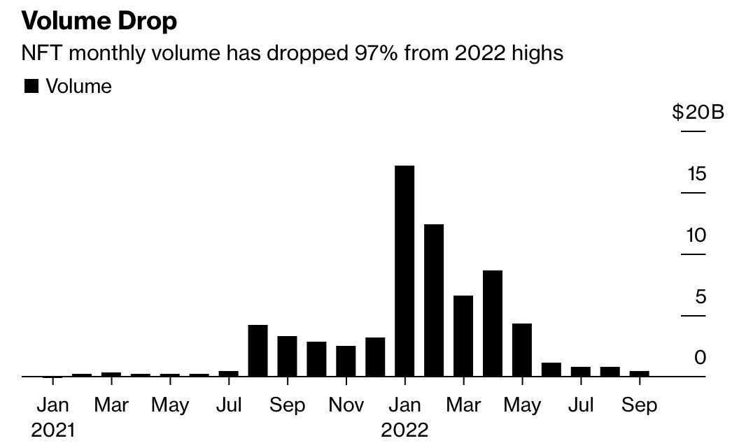 전 세계 NFT 거래량이 올해 1월 최고치를 찍고 약 97%가 빠졌다. 지금은 대다수가 NFT에 대해 들어본 적도 없는 작년 초 수준이다. 이 정도면 NFT가 무엇인지 알기 때문에 사람들이 더 이상 NFT를 사지 않고 있다고 해석할 수 있다. NFT 시장은 코인 투자의 시황에 밀접하게 움직였고, 코인 시장은 대체 투자처로 주식/펀드 시장에 밀접하게 움직였다. NFT 시장에서 모두 발가벗고 수영하고 있다는 것을 알린 것은 높은 금리였다. 큰 변동성만 가지고 펀디멘털이 없던 NFT에 대한 시장의 시선은 Speculative에서 Negative로 돌아섰다. NFT는 매우 위험한 투기성 자산으로 인식되고 있다.