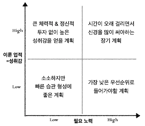 미루려는 자들은 사실 계획하기 좋아한다. 문제는 이 계획들이 너무 장대하고 막연하다는 것이다. 또 우리는 계획이라는 것을 했을 때 무언가를 시작했다는 착각을 한다. 듣기만 좋은 이러한 계획들은 원숭이만 좋아할 뿐이다. 그래서 우리가 해야 할 것은 우선순위를 매기는 것이다. 성취감이 높을 것들과 중요한 것들을 상위 목록에 올리는 작업이다.