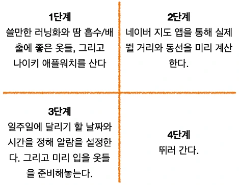 그리고 우선순위 중 1~2개를 선정해 구체적 실행 가능한 계획을 촘촘하게 짠다. 아래는 내 RUNNING FITNESS 프로젝트 계획이다. 나는 유산소 뜀박질이 좋다.