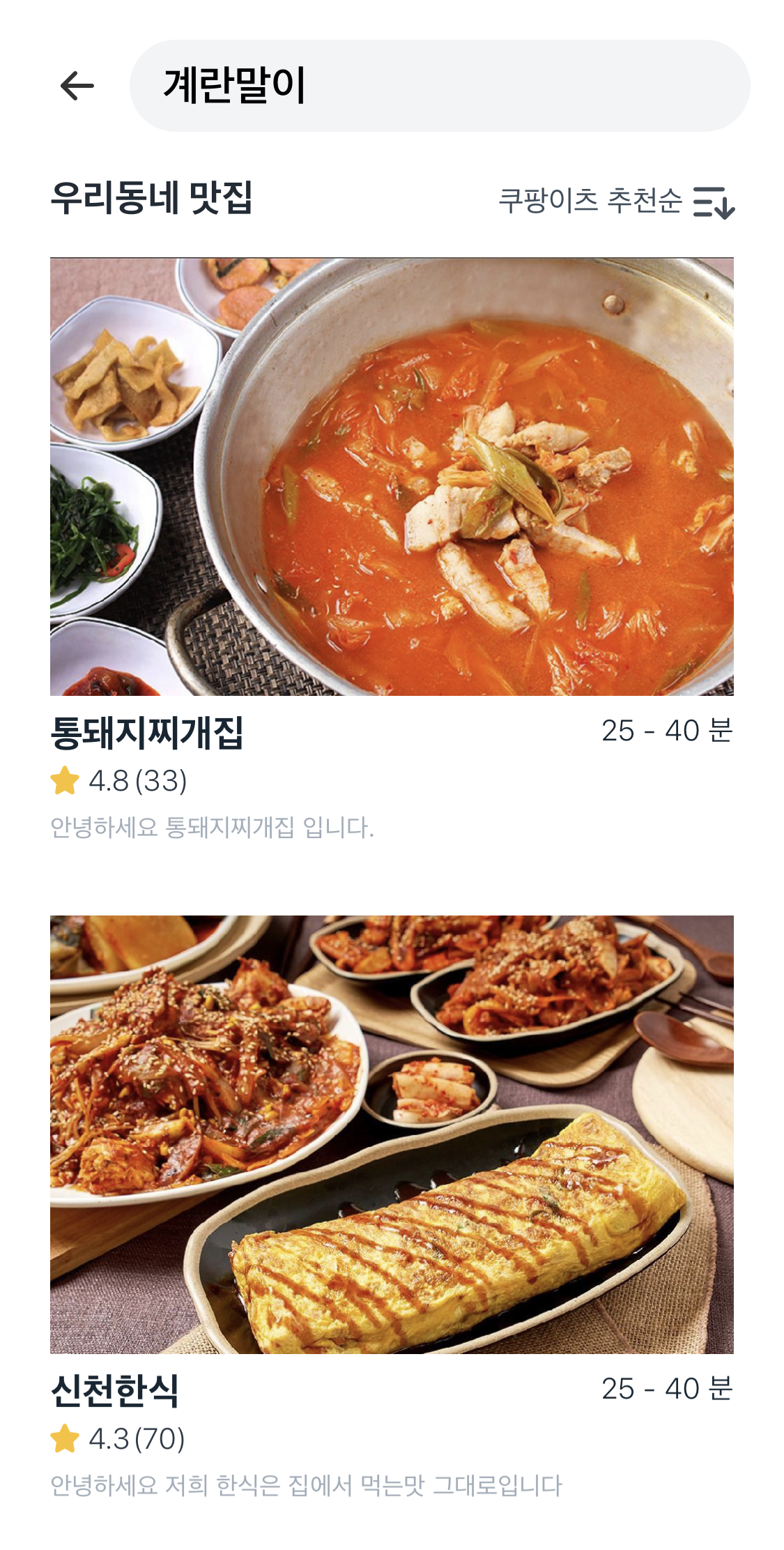 하지만, 쿠팡이츠에서는 검색창을 만들어 위와 같은 불편한 점을 한 방에 해결 해 주었다. "계란말이"를 검색하면 이 메뉴를 파는 업체들 목록이 나온다. 목록에 뜬 가게 중 주문 하고 싶은 곳만 클릭하면 끝이다.