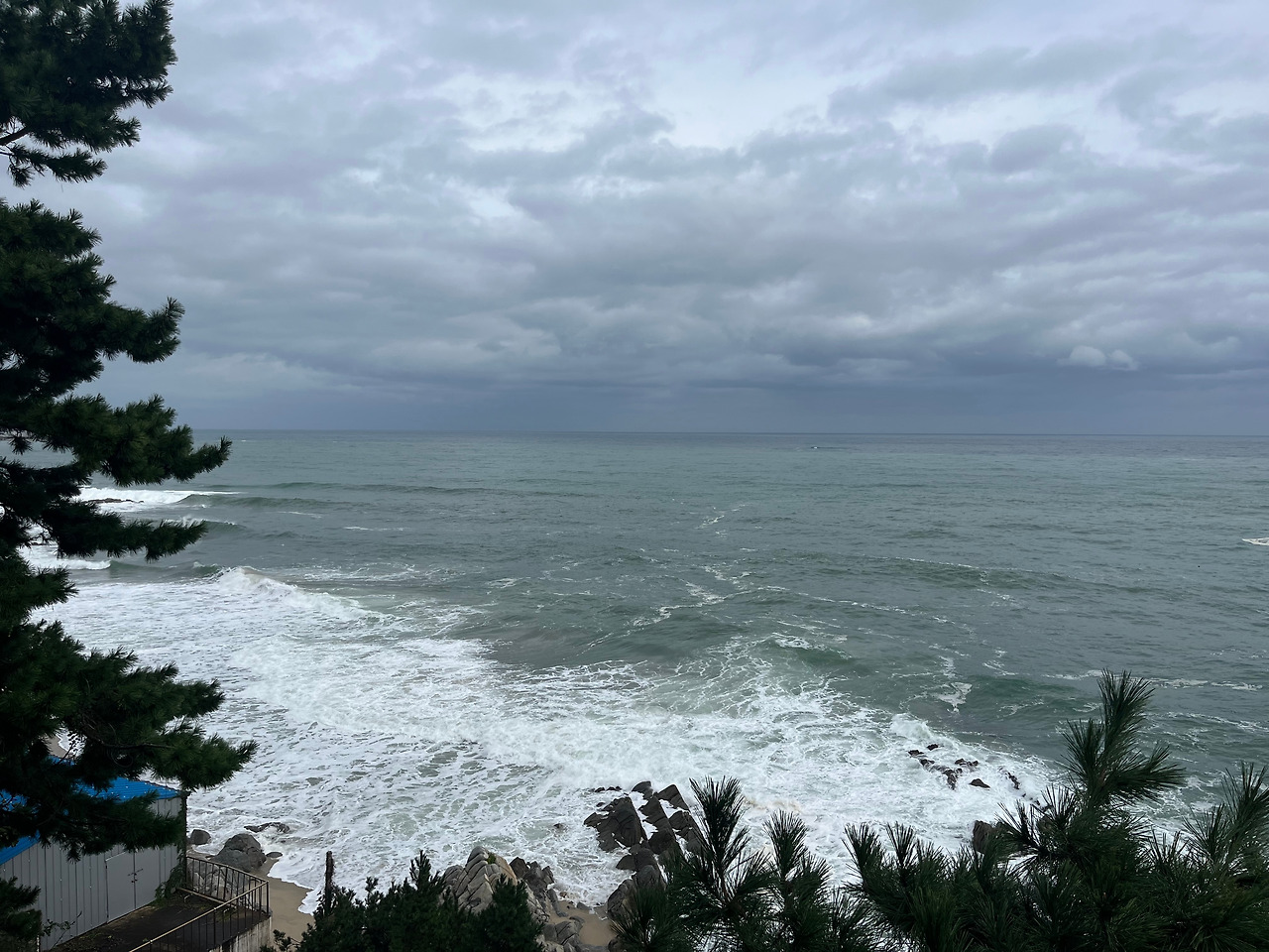 해당 휴게소에서 화장실로 내려가는 계단은 무명의 전망대였다. 철썩철썩 바위에 부딪히는 파도 소리와 멀리서부터 휘감는 물 소리는 정말 경이로웠다. AI도 감히 구현하지 못할 자연 그대로의 소리에 한참을 바라본다.