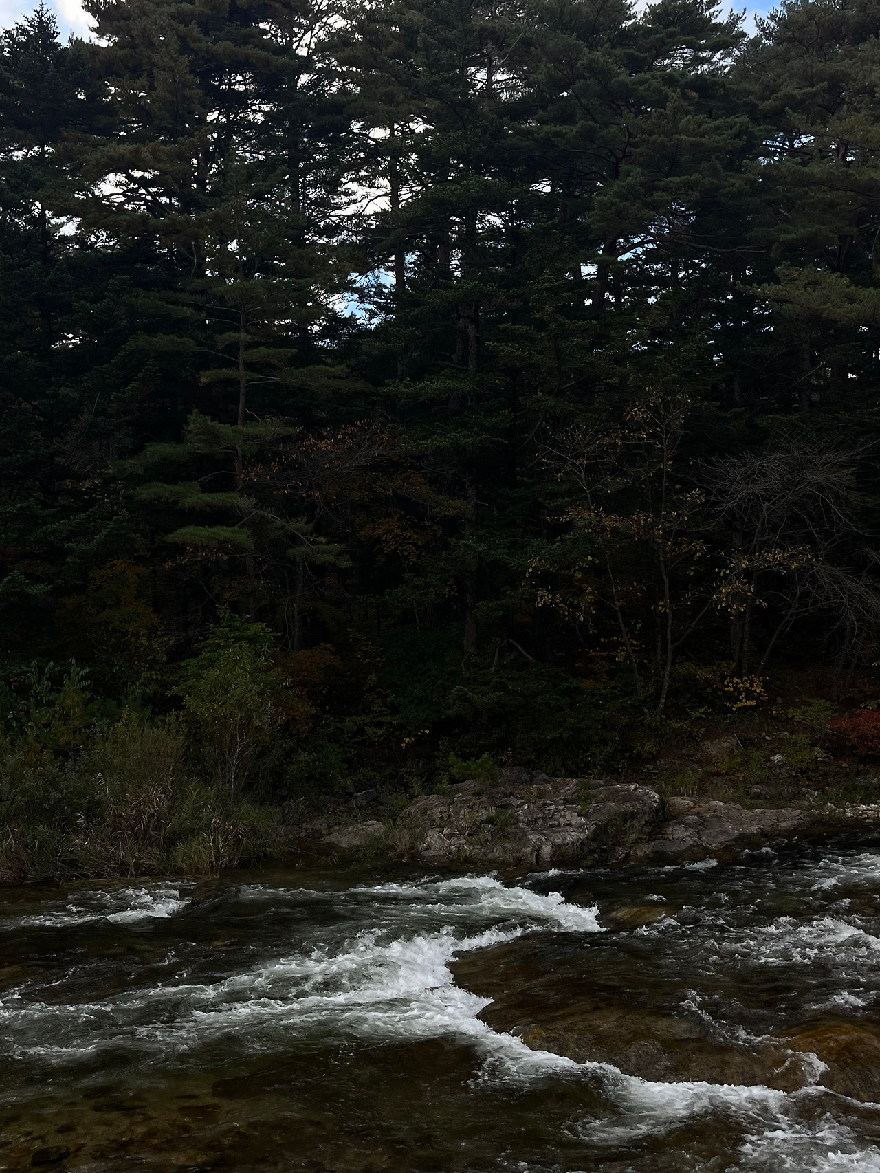 아리야 숲 옆으로 흐르는 물. 아마도 오대산 위에서부터 월정사를 타고 이곳까지 흐르는 물 같았다. 최후에 이 물은 어디로 가게 될까? 저 멀리 아래를 쳐다본다.