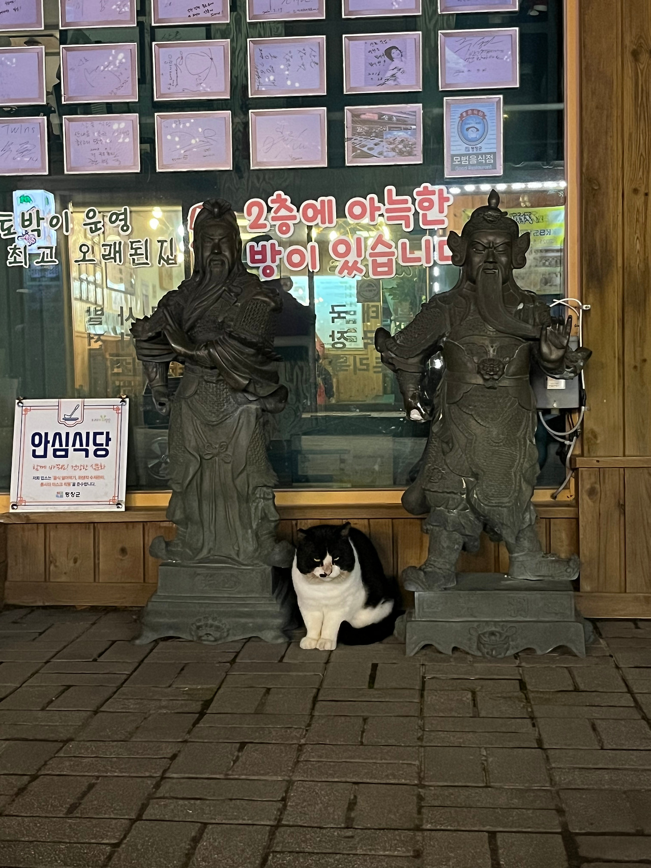 달마대사를 똑닮은 고양이를 만났다. 신장님 사이에 떡하니 앉아있는 고양이를 감히(?) 귀여워 할 수 없었다.