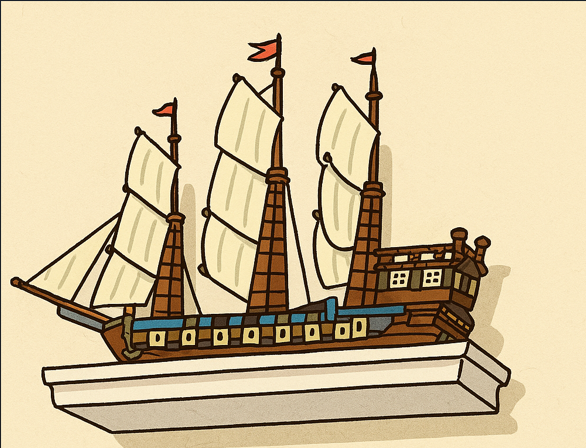 벽 위 높은 선반에는 범선이 정박해 있다.
