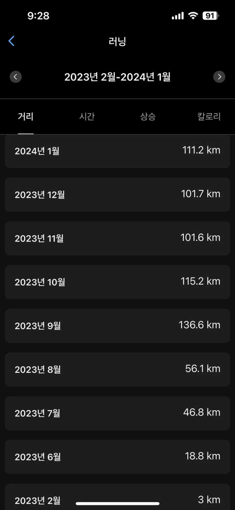 23년 1월 3km로 시작해서... 6월 18km, 7월에는 46km, 8월에는 56km를 뛰었더라.