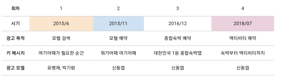 그동안 진행해온 캠페인은 여기어때 히스토리, 그 자체라고 해도 과언이 아닌데요. 매 회 여기어때 인지도를 가파르게 끌어올렸던 네 편의 광고를 분석해 보겠습니다.