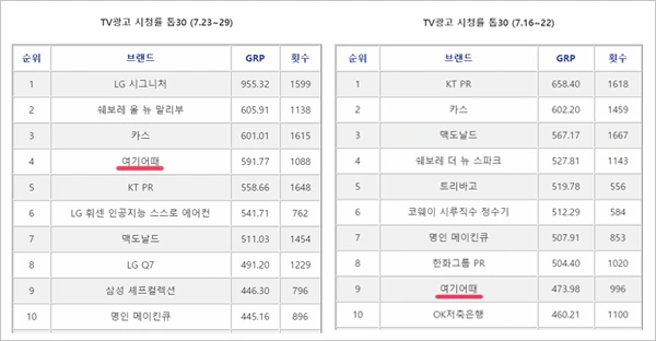- 5주 연속 광고 시청률 top 10 (7월 1주차~8월 1주차)