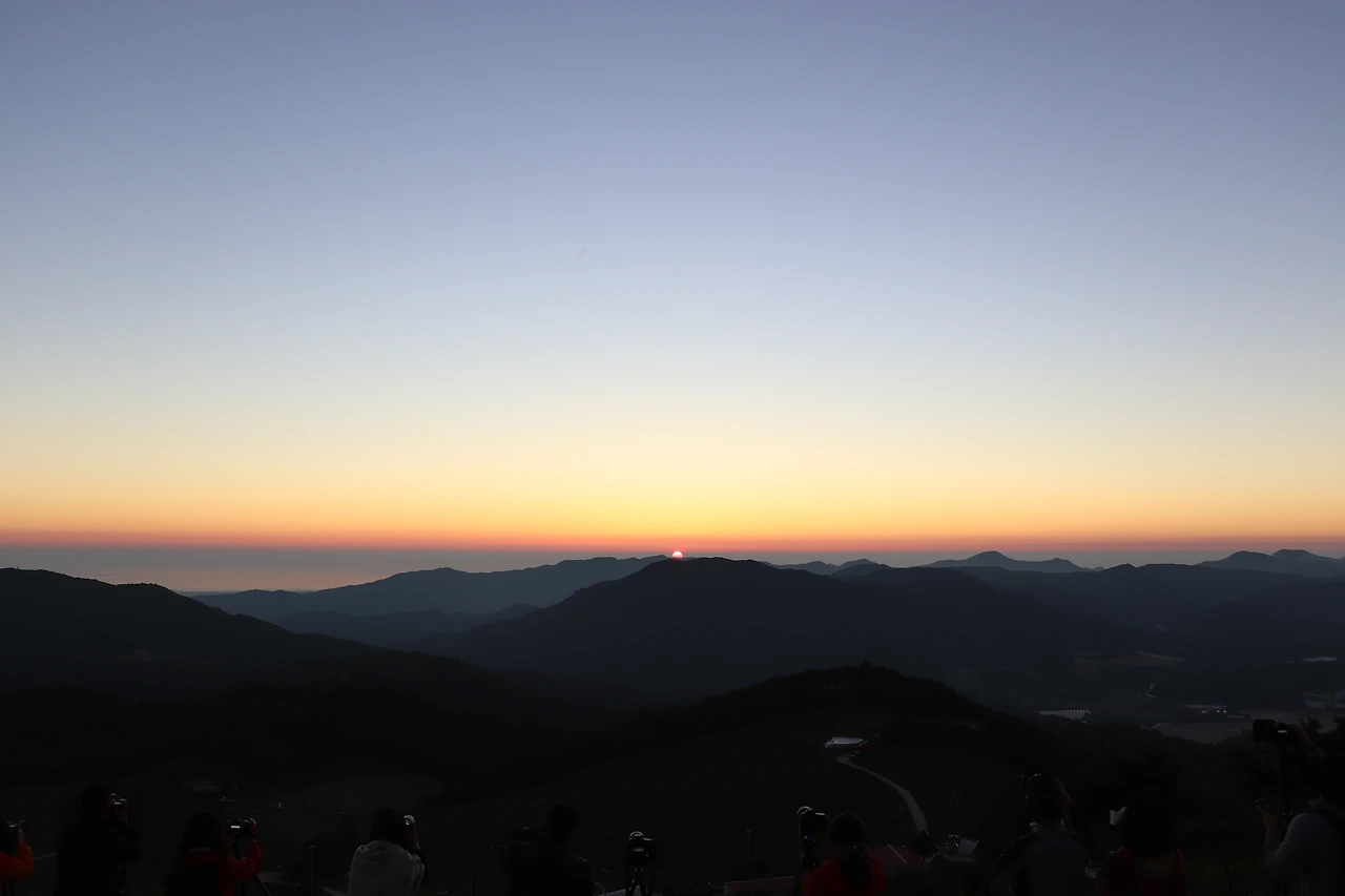 전망대 아래쪽에 마련된 주차장에 차를 세우고 50m 정도 걸어 올라가니 이미 20명 남짓된 사람들이 삼각대에 카메라를 올린 채 노출을 맞추고 있었다. 어떤 이는 차박을 한 듯 담요를 어깨 위로 두르고 붉게 물든 먼 산을 내려보고 서있다.