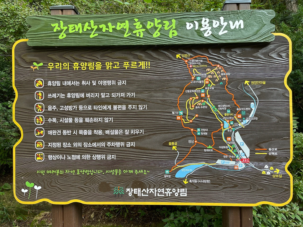 토요일 이른 아침 출발, 2시간 정도 운전 후 장태산자연휴양림에 도착했다. 이른 시간이라 주차장은 텅텅 비어 있었다. 9시쯤 '정문 안내소'에서 발열 체크와 방문 일지를 작성한 뒤 숲으로 난 길을 따라 올라갔다.