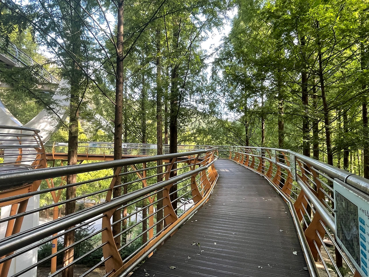 숲체험 스카이웨이에서는 테크 길을 따라 메타세콰이어 나무 사이사이를 걸을 수 있었다. 나무 그늘 아래 불어 오는 바람이 시원했다.
