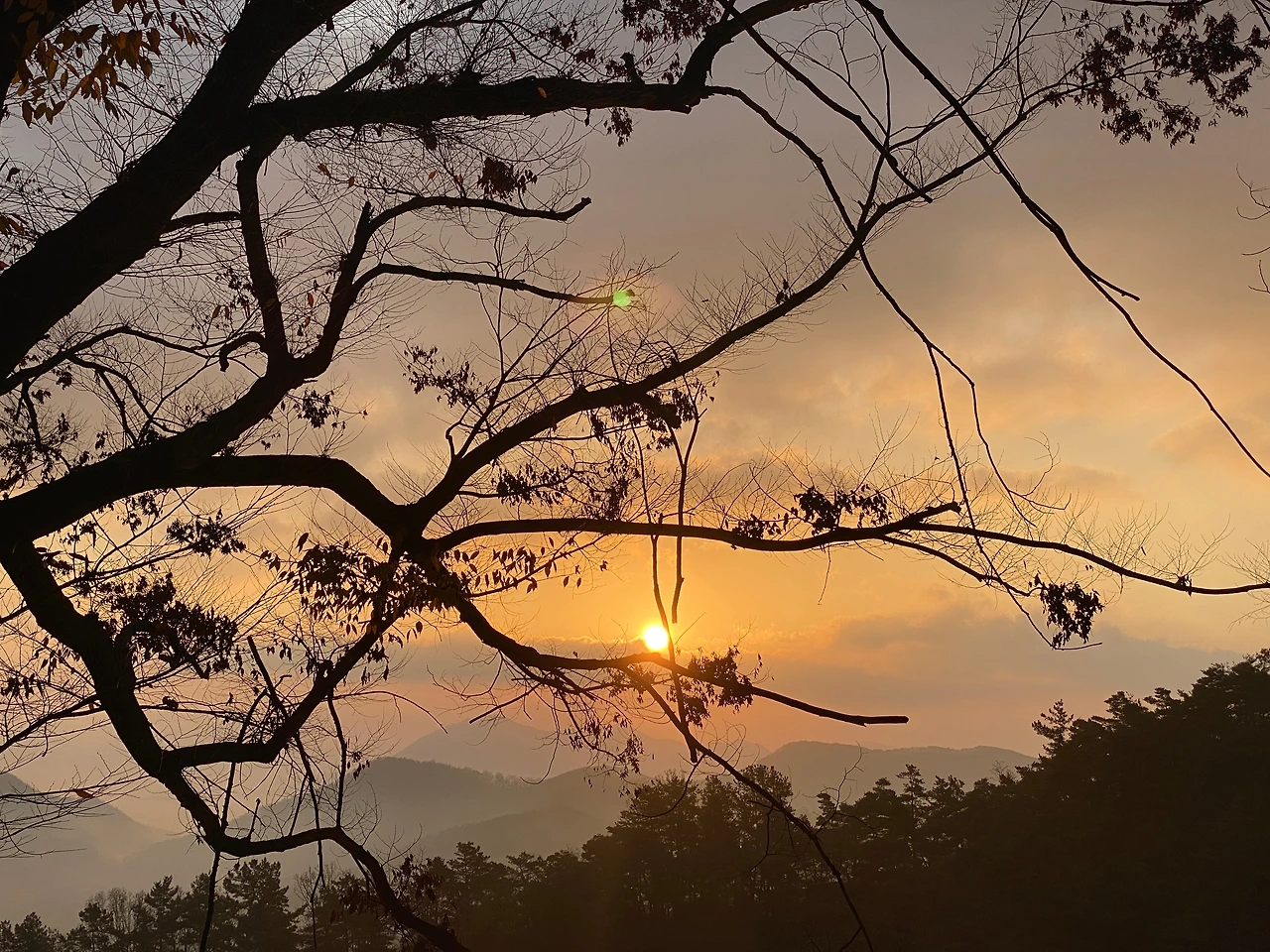 산 너머 가려진 구름 사이로 해가 얼굴을 내민다.