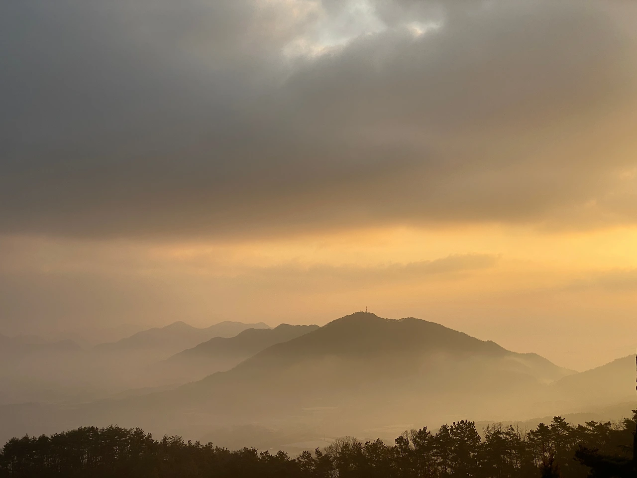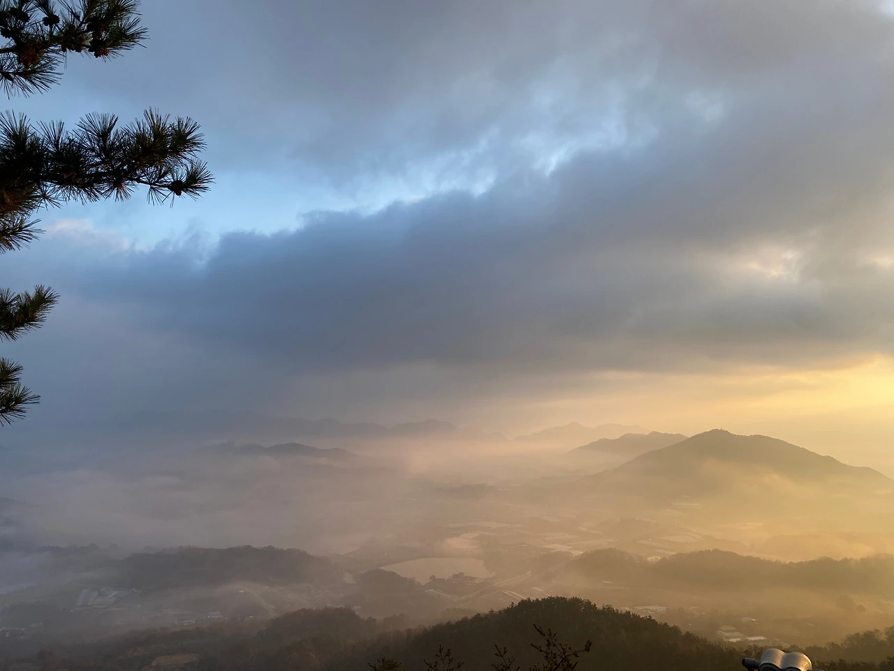 솜이불을 펴 놓은 듯 구름이 낮게 깔려 있다.