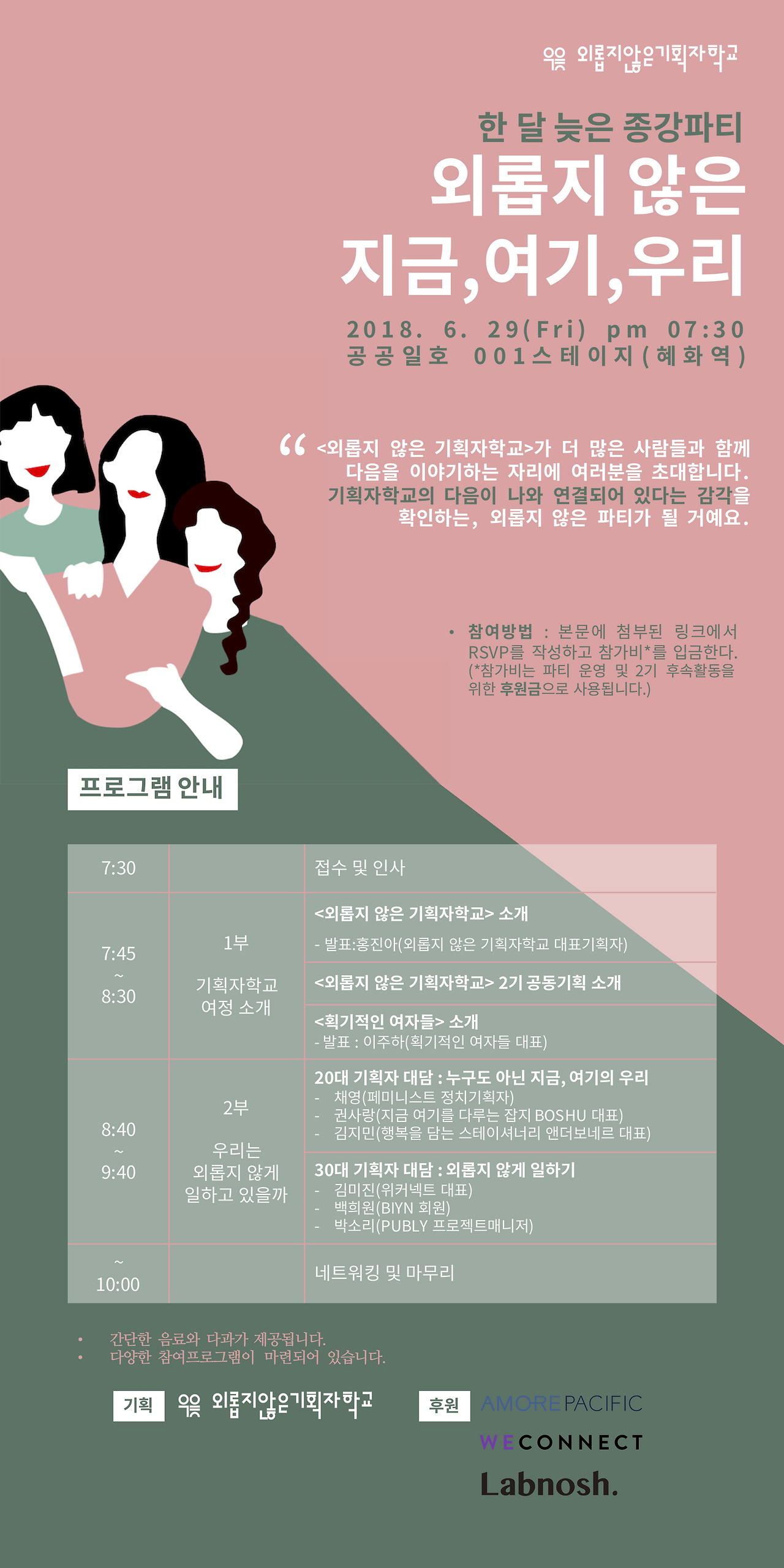 * <외롭지 않은 기획자학교> 종강파티는 아모레퍼시픽, 위커넥트, 랩노쉬의 후원으로 진행됩니다.