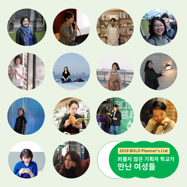 그래서 연말 결산으로, 기획자학교가 만난 열 네명의 여성들을 소개합니다. 앞으로 외롭지 않은 기획자학교가 계속 될수록 이 리스트는 더 길어지겠죠? 누군가 마이크를 줄 여성 실무자/리더를 찾을 때 'Bold Planner's List'를 먼저 찾아보게 되는 날이 오게 되기를 바라는 마음으로 시작합니다.