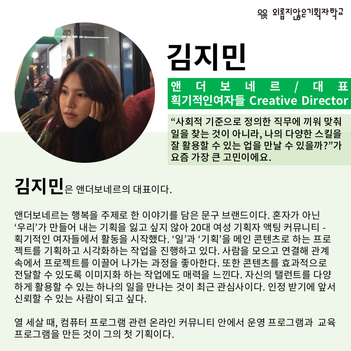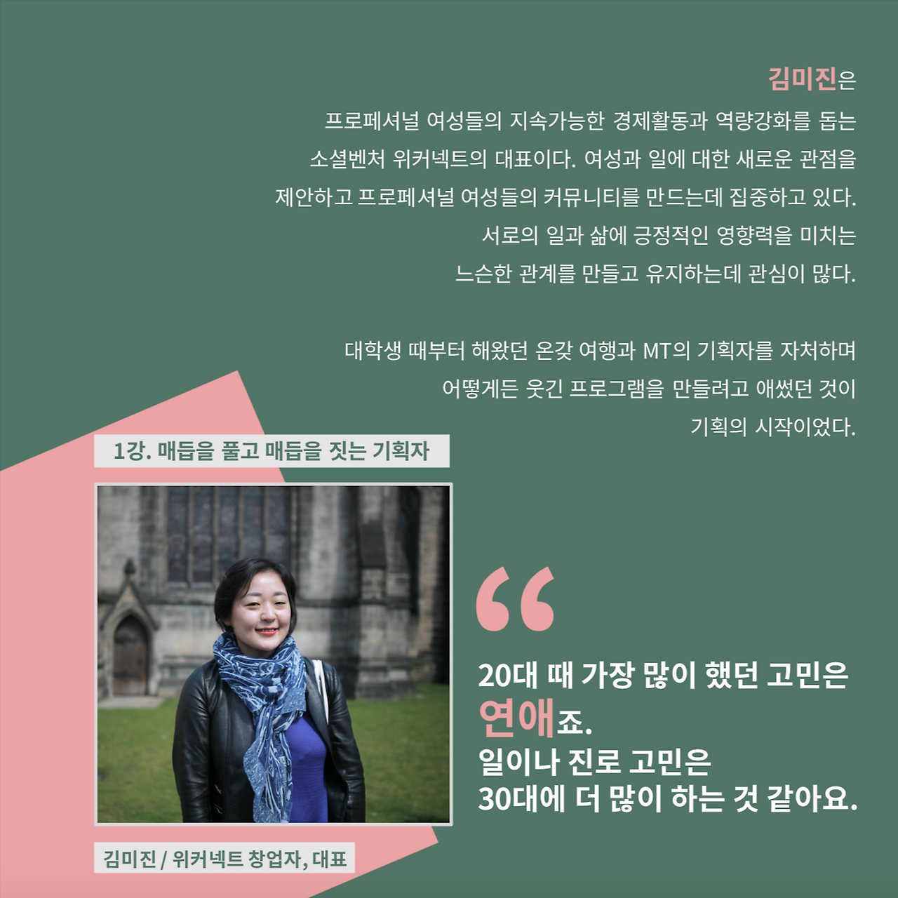 기획자학교's Point : 1기에 모시고 또 모시고 싶어 한 번 더 모신 여성 리더. 시작하기에 주저하는 마음이 먼저 든다면 김미진님을 찾아주세요. 야심차게 뭐든 시작해 볼 수 있는 용기를 얻게 될 거예요.