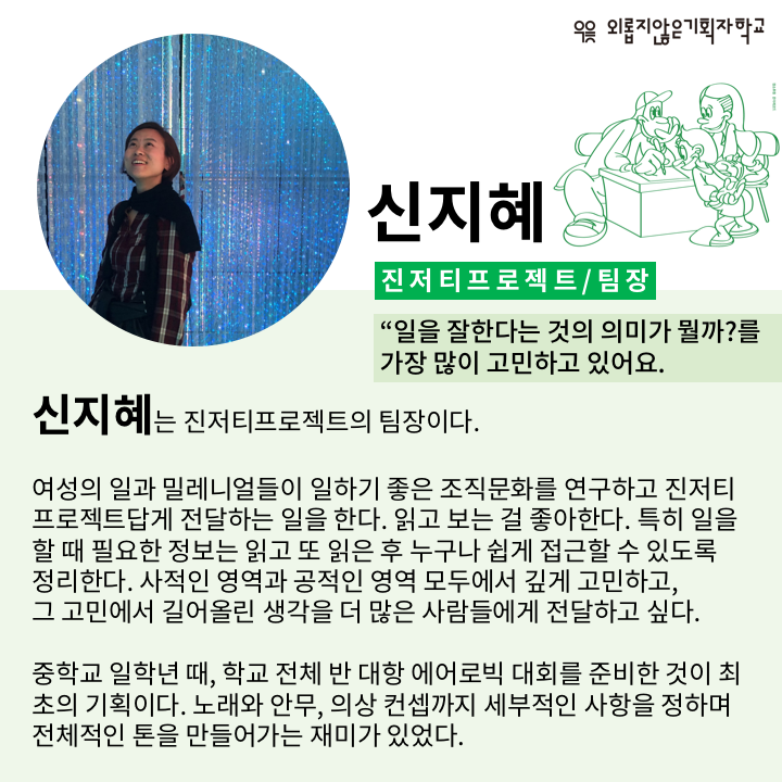 기획자학교's Point: 신지혜님은 여성의 일과 조직문화를 연구합니다. 경력보유여성을 위한 소셜섹터 공동채용 프로그램, 임팩트커리어W 프로그램에서 교육을 담당하고 있기도 해요. 우리가 우리의 일에 이름 붙이며 일할 수 있다는 것을 아는 것과 모르는 것은 이후 일의 맥락을 찾아가는데에 도움이 됩니다. 불안하고 분절된 일 경험을 '나'라는 맥락으로 꿰고 싶으시다면 신지혜님을 만나보세요!