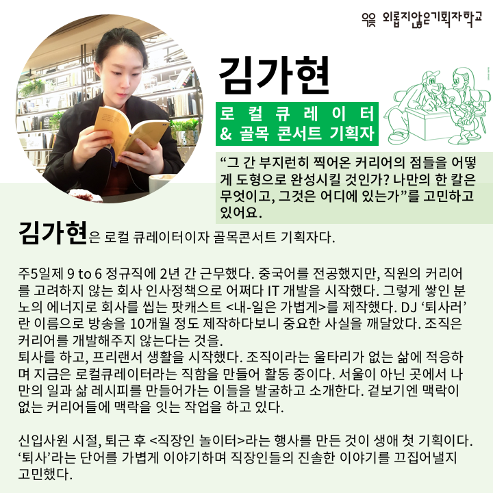 기획자학교's Point : 타고난 성실함을 바탕으로 '일 할 준비'를 했던 김가현님의 대학생 시절의 이야기를 들으면 입사란 무엇인가, 묻게 됩니다. 기업에서 웹기획자로 근무하면서 진행한 사이드 프로젝트는 이후 자기 일을 만들어 나갈 수 있는 원동력이 되기도 했어요. 변화하는 일 환경, 그 안에서 답을 찾고 있는 사람들의 이야기가 궁금하신가요? 김가현님을 만나보세요.