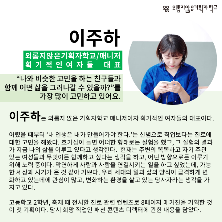 기획자학교's Point : 6월에 있었던 행사를 마무리하며 진행자였던 이주하님이 한 말은 그냥 말로 끝나지 않았습니다. 획기적인 여자들은 올 가을 <일상매거진>이라는 잡지를 만들어 일하는 20대들의 이야기를 담아냈어요. 미디어의 시선도, 이미 이 시기를 거쳐간 선배들의 목소리도 아닌, 지금, 여기의 우리들의 이야기를 오롯이 담아낸 콘텐츠를 만든 것이죠. 획기적인 여자들을 이끌고, 외롭지 않은 기획자학교의 매니저를 맡고 있는 이주하님에게 일하는 20대의 이야기를 들어보세요!
