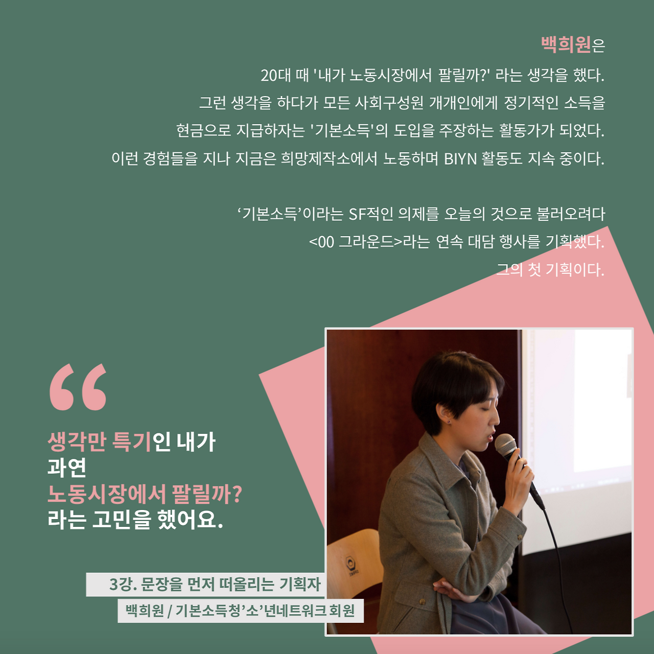 "20대 기획자들이 꼭 어디로 가야하고, 또 완전한 무엇이 되기 위한 과정 중에만 있는 사람들이 아니라는 것을 얘기하고, 자기 자리에서 마주한 문제들을 어떻게 해결하고 있는지 알아보기 위해 오늘 자리가 마련되었습니다. 시간이 짧아서 고민만 늘어놓고, 수습하지 못하고 끝나는 것 같지만, 저희는 이 자리가 출발점이라고 생각해요. 미디어에서 보도하는 20대들의 이야기만이 아니라, 자기 삶과 일을 꾸려가려고 노력하는 20대의 이야기를 확산시키고 또 서로 연결되도록 하기 위해 우리가 해야 할 일을 해나가겠습니다."