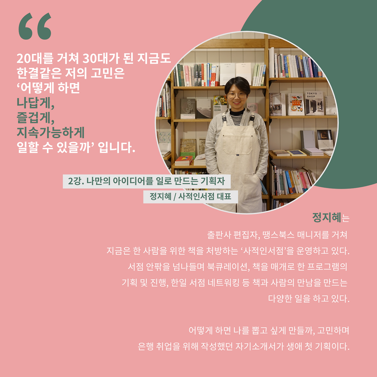 기획자학교's Point : '이건 나에게만 좋은 거 아니야?'라는 마음이 들어 기획을 실현시키지 못하고 있다면 정지혜님을 만나보세요. 기획을 더 날카롭고 뾰족하게 벼려야 할 때 나만의 관점과 취향이 얼마나 중요한지 깨닫게 되실 거예요.