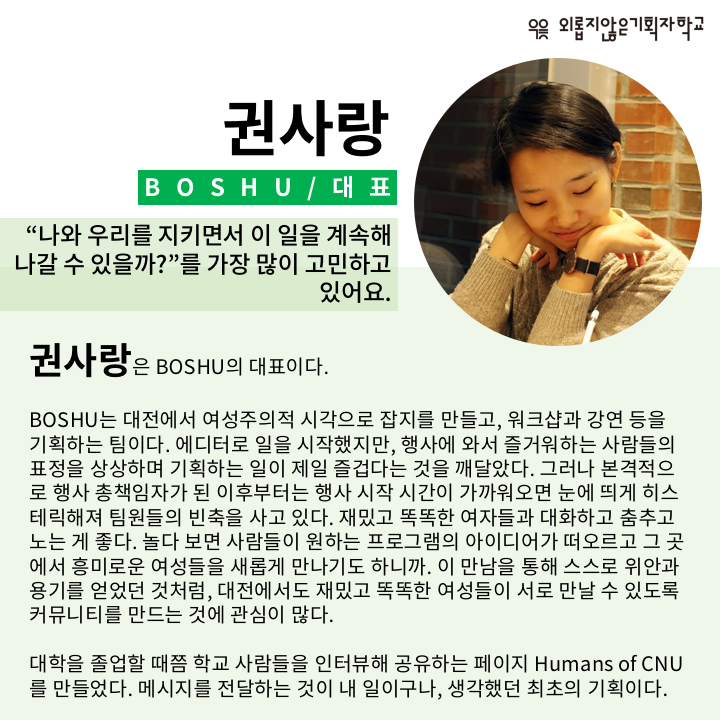 기획자학교's Point : 보슈는 '이름 붙일 수 없는 사람을 위해, 자신과 주변을 위해’ 만드는 잡지입니다. 잡지만 만들지 않고, 잡지를 둘러싸고 만들어지는 다양한 이야기들로 커뮤니티를 만드는 활동도 하고 있어요. 주짓수 모임, 여자축구 모임에서부터 DJ파티까지. 콘텐츠에 공감하며 모인 사람들은 어떤 이야기를 나누고 어떻게 연결되어 있을까요? 보슈가 만들어 내는 콘텐츠와 커뮤티가 궁금하시다면 권사랑님을 만나보세요!